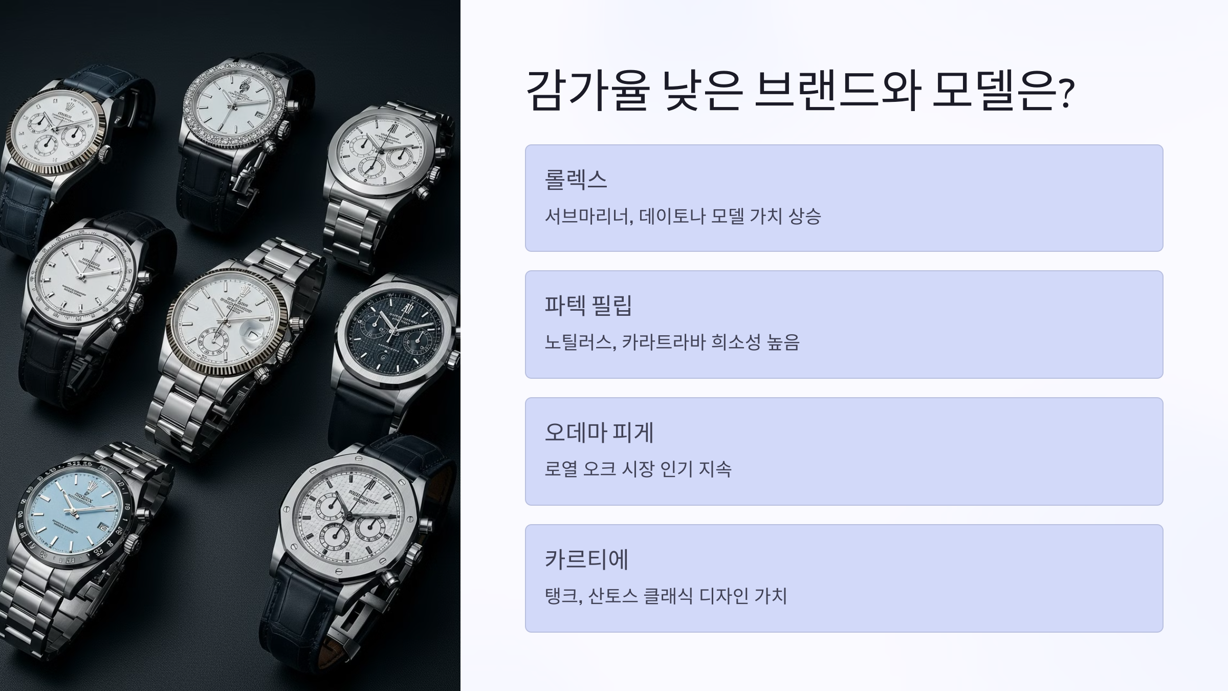 | 수요 | 인기 모델일수록 가격 상승 | 롤렉스 서브마리너 같은 모델은 감가율이 낮음 |
