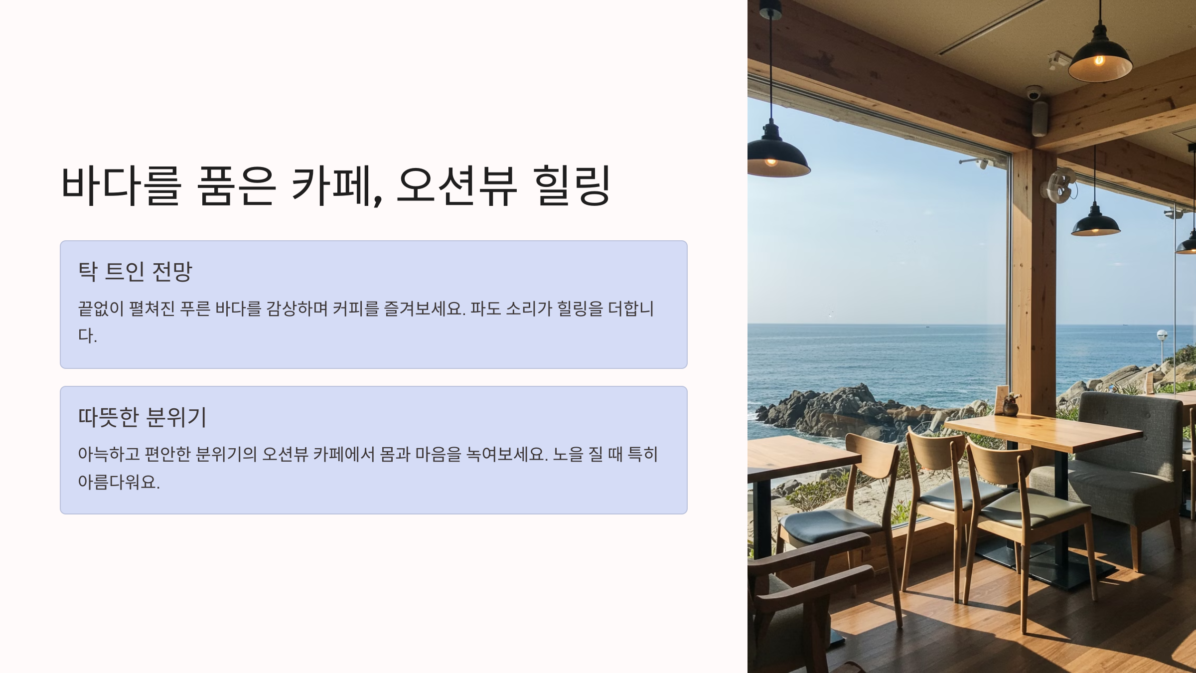 다음으로, 바다를 보며 커피 한잔할 수 있는 오션뷰 카페를 추천해 드릴게요! 🌊☕
