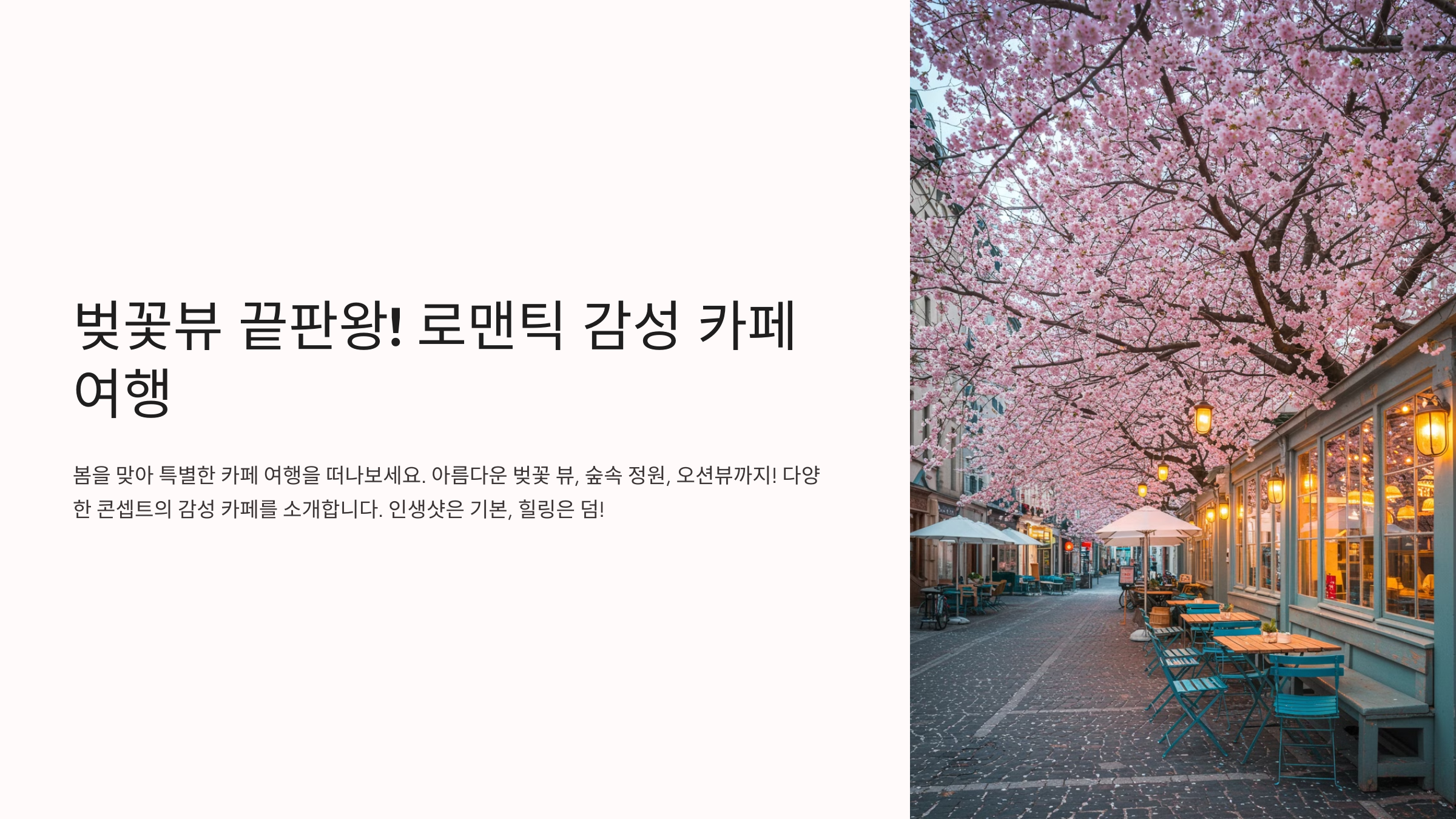 따뜻한 봄날, 감성 넘치는 카페에서 커피 한잔하며 여유를 즐기고 싶지 않나요? 🌸☕ 아름다운 벚꽃 뷰, 초록이 가득한 숲속, 바다를 한눈에 담을 수 있는 오션뷰까지! 올봄, 꼭 가봐야 할 감성 카페들을 소개할게요.