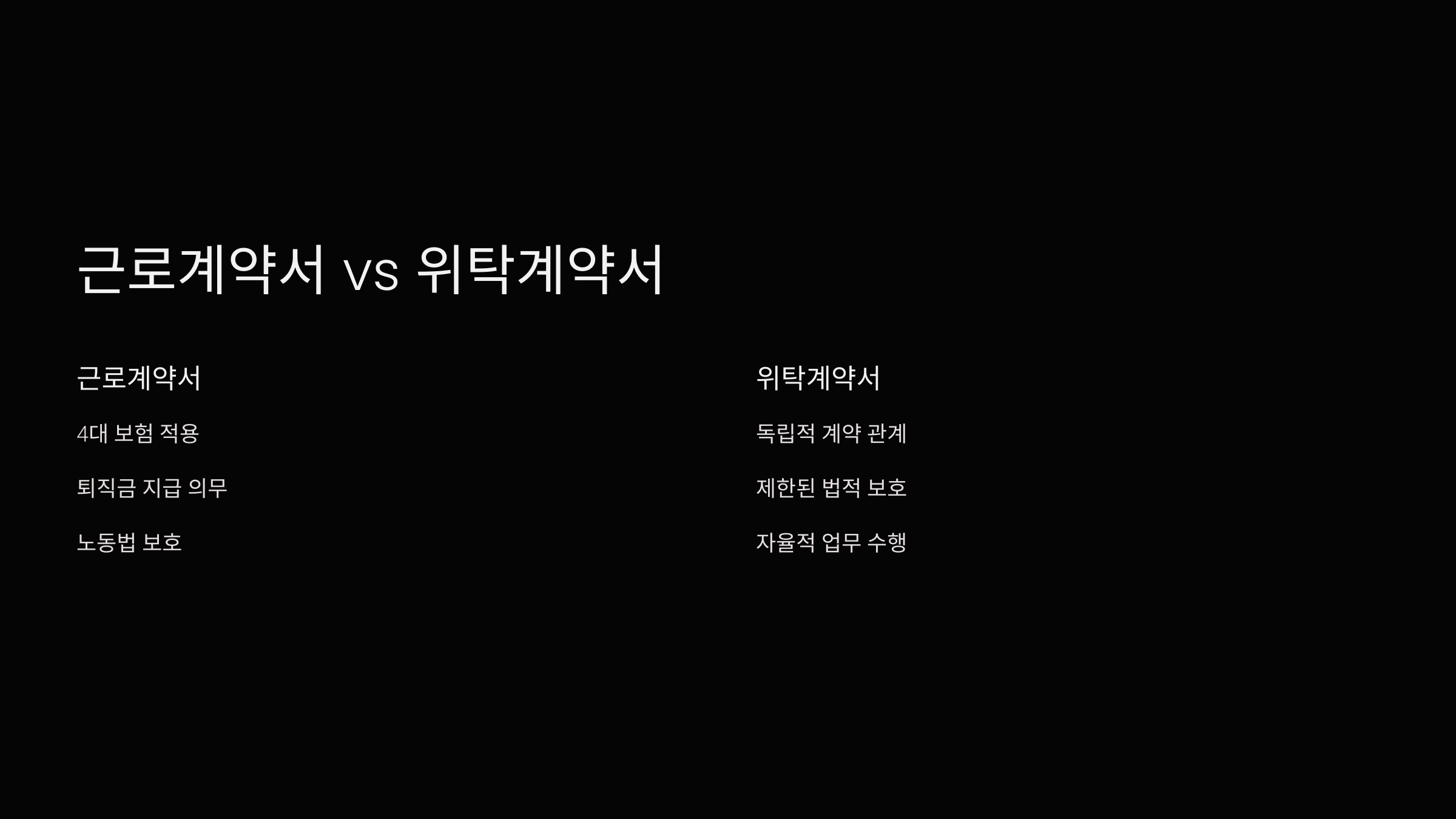 반면 위탁계약서는 민법상 ‘위임’ 또는 ‘도급’ 계약이에요. 근무시간이 자유롭고, 결과물 중심으로 보수를 받는 구조예요. 4대보험, 퇴직금, 근로시간 보호가 해당되지 않아요.