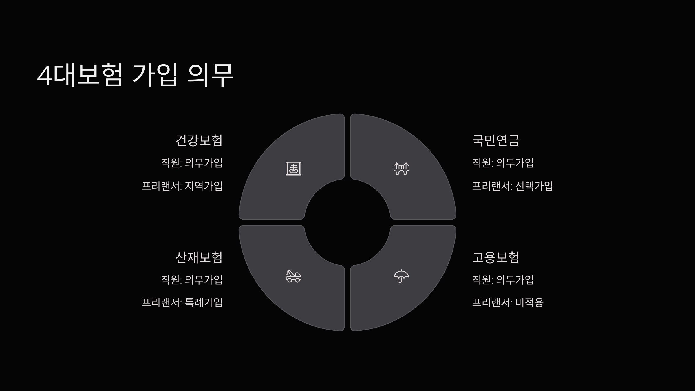 | 4대보험 | 사업주·직원 의무가입 | 임의 가입 또는 제외 |
