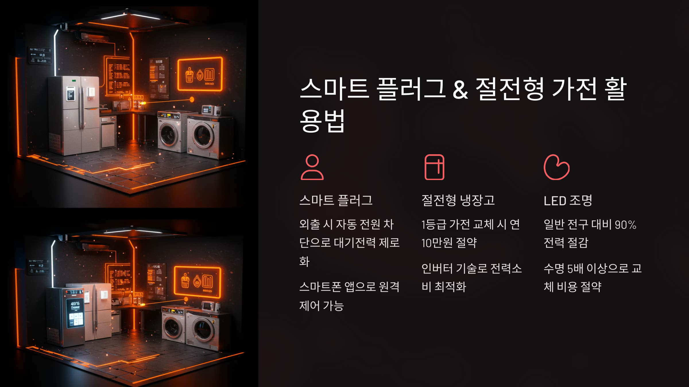 | 추천 제품 | IoT 스마트 플러그, 원격 제어 콘센트 | 인버터 냉장고, LED 조명, 절전형 에어컨 |
