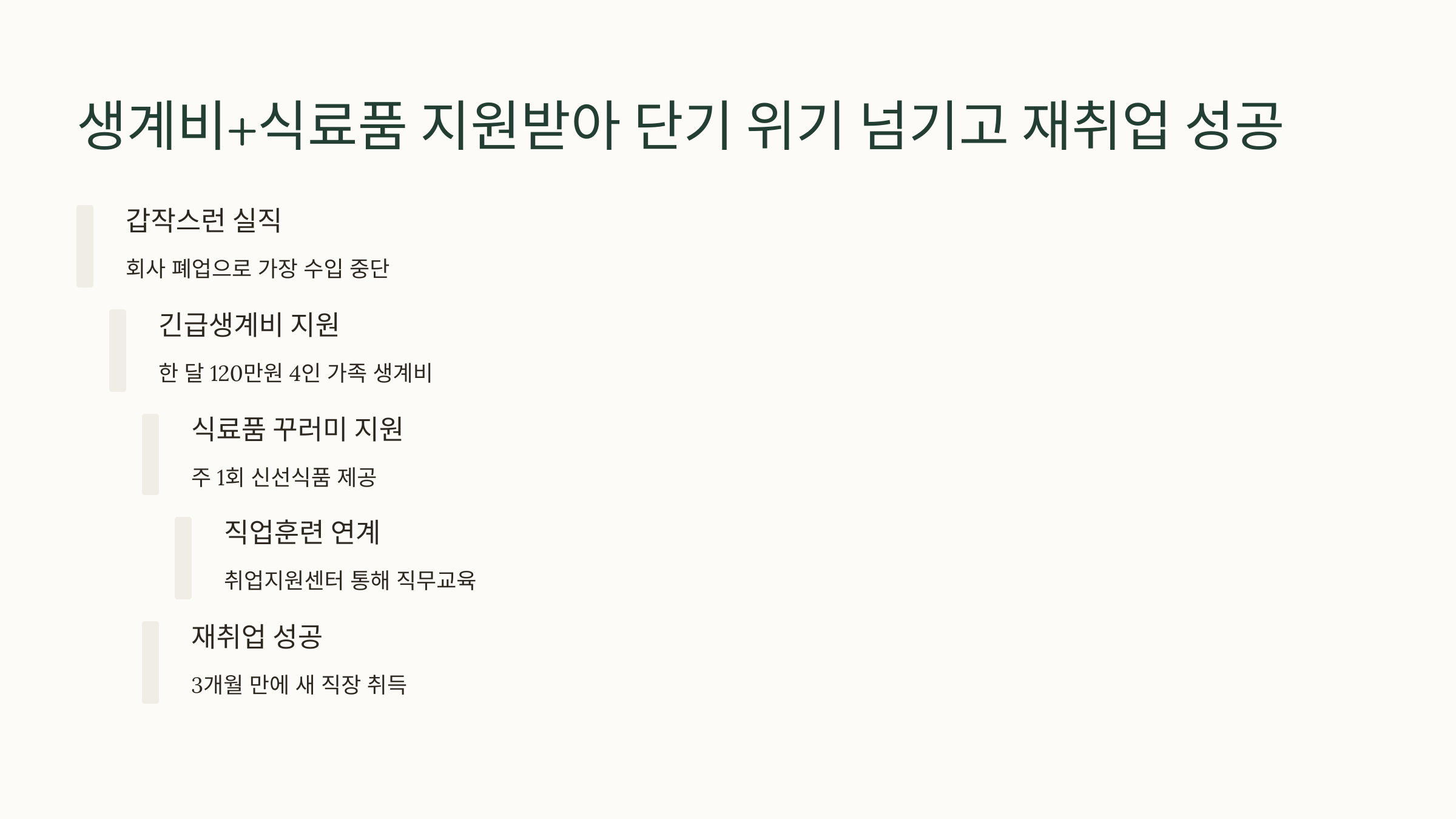 이제 생계비와 식료품 지원을 동시에 받으며 위기를 넘기고 재취업에 성공한 이야기로 이어집니다! 🍱