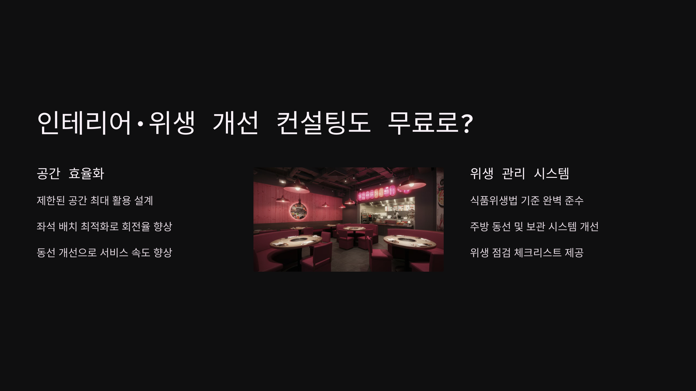 | 인테리어 구조 | 조명, 좌석, 간판, 배치 최적화 | 현장 사진 또는 방문 컨설팅 |