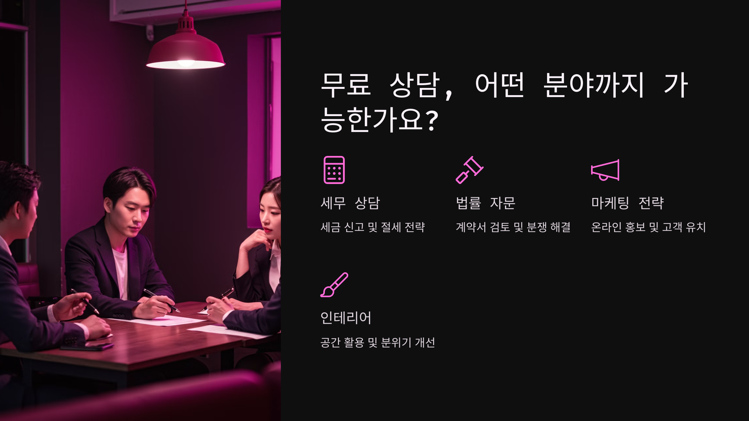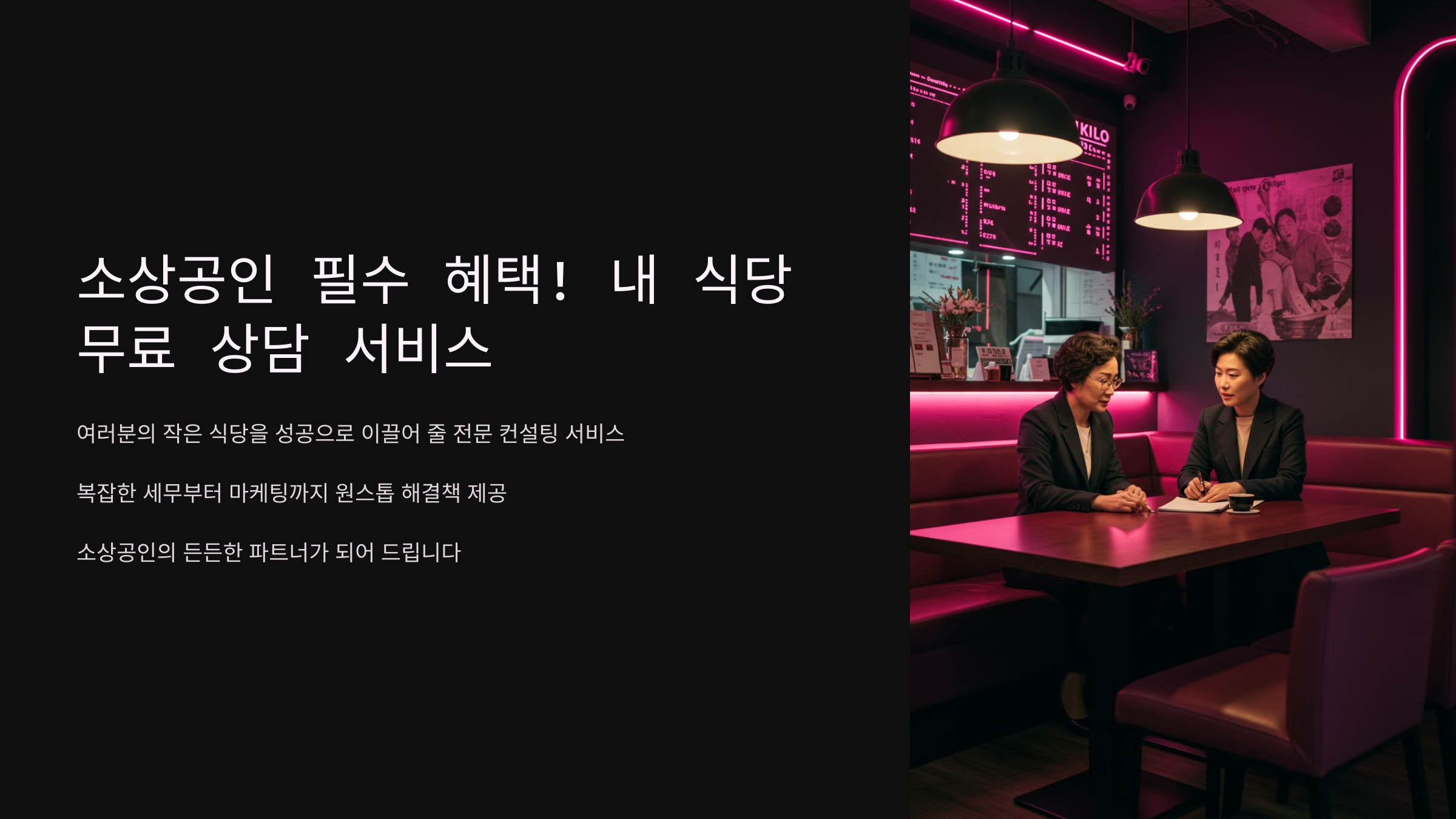 “혼자 해결하려다 지치셨나요?” 이제는 전문가가 무료로 도와주는 시대! 내 식당 운영이 더 탄탄해지는 기회, 절대 놓치지 마세요!