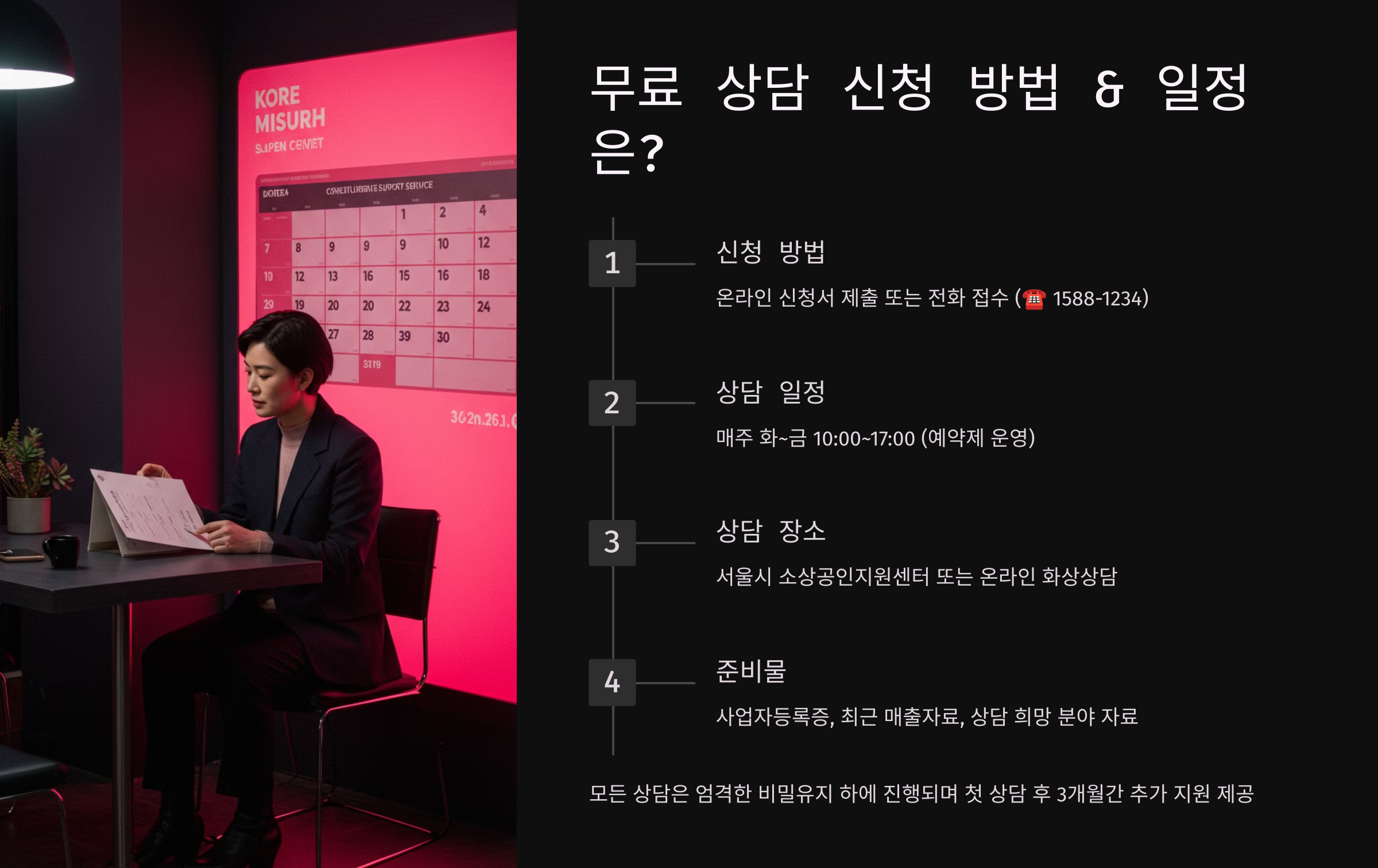 이제 마지막 섹션으로 넘어갈게요! 무료 상담 신청 방법부터 일정, 신청서 링크, 접수 절차까지 한 번에 안내해드릴게요!