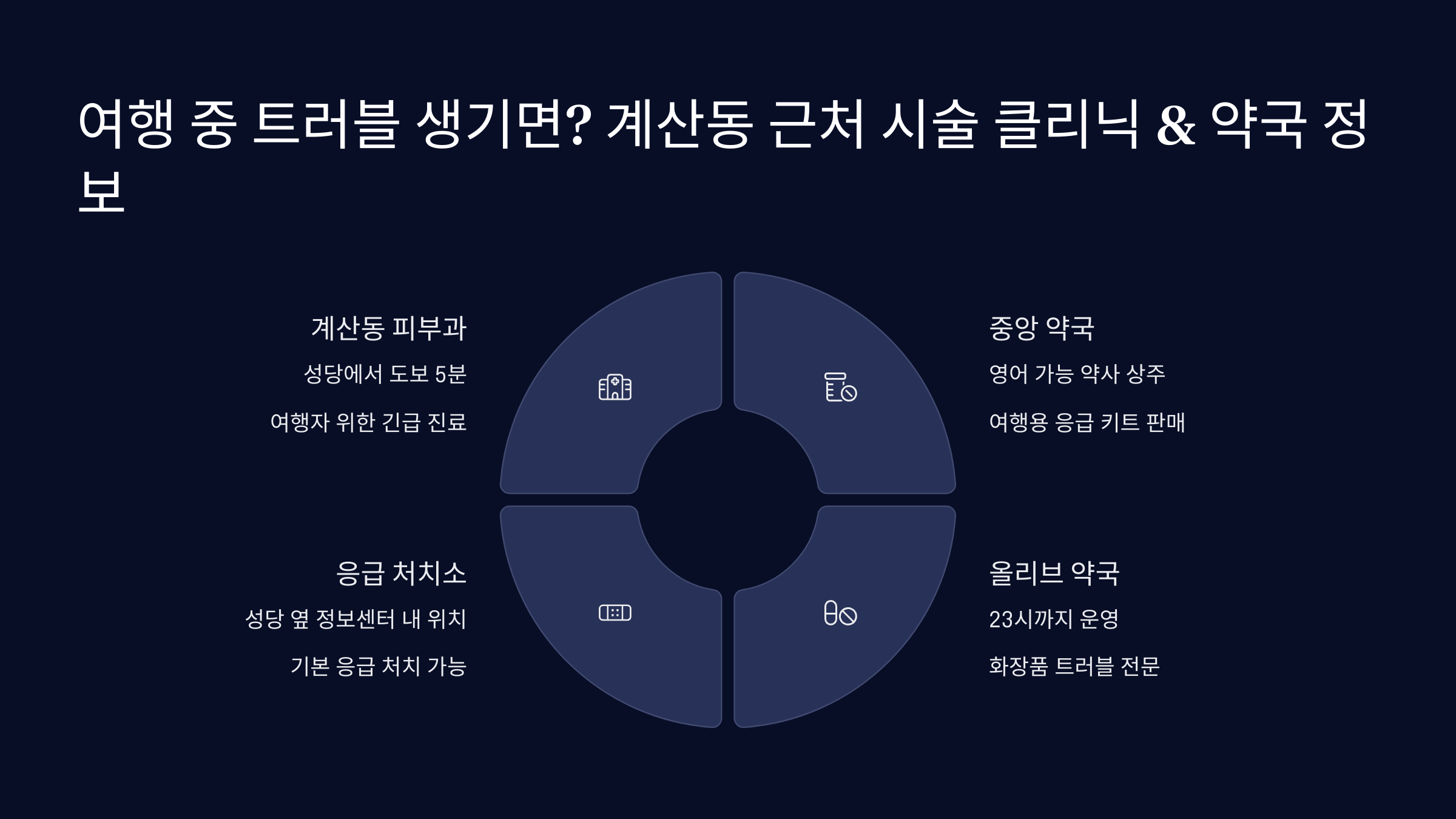이제 다음은 여행 중 갑자기 피부 트러블이나 사고가 생겼을 때, 가장 빠르게 진료 가능한 계산동 인근 클리닉 & 약국 정보로 이어집니다!
