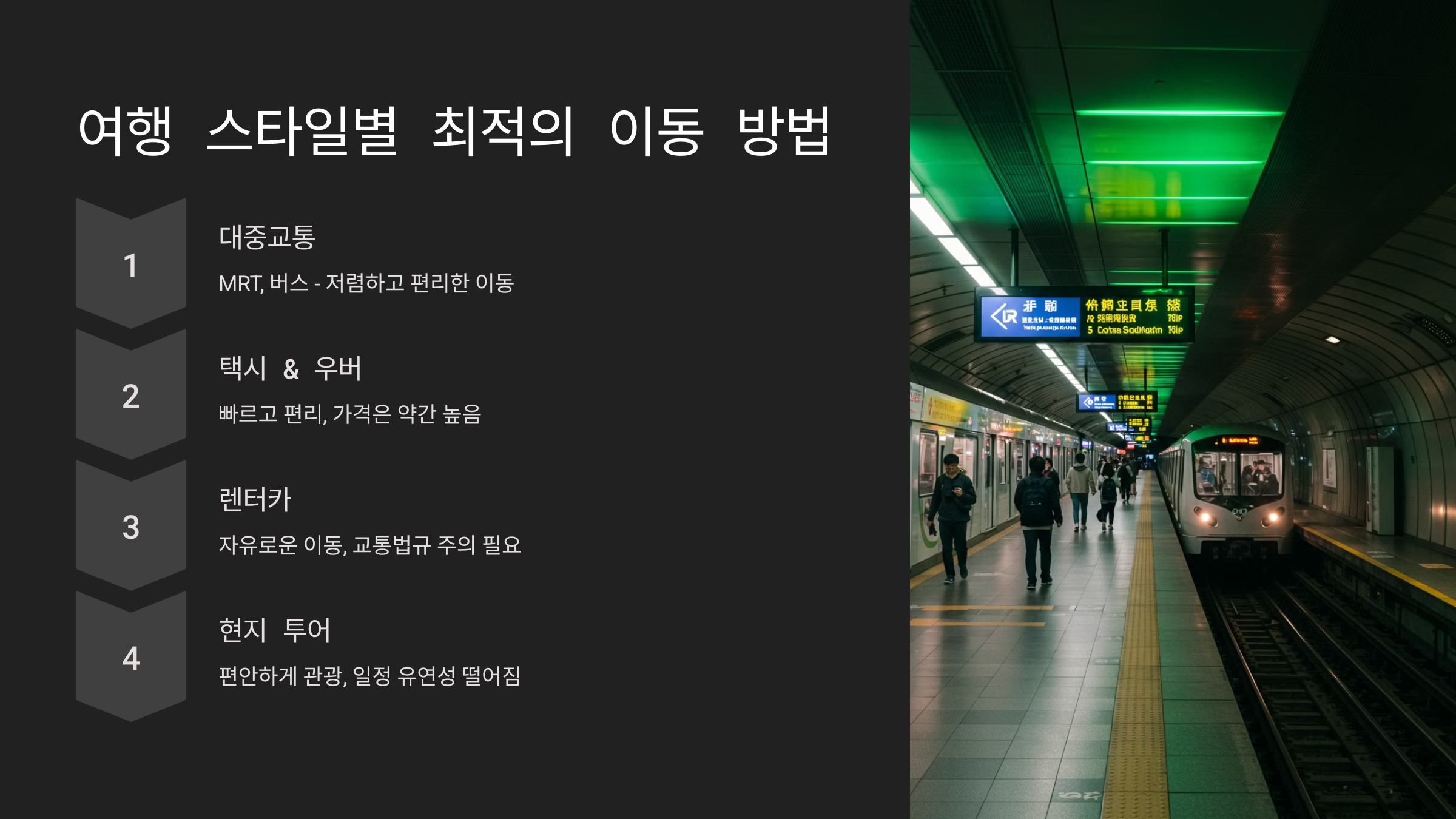 | 🚇 MRT (지하철) | 저렴하고 빠름, 대부분의 관광지 연결 | 심야에는 운행 안 함 |