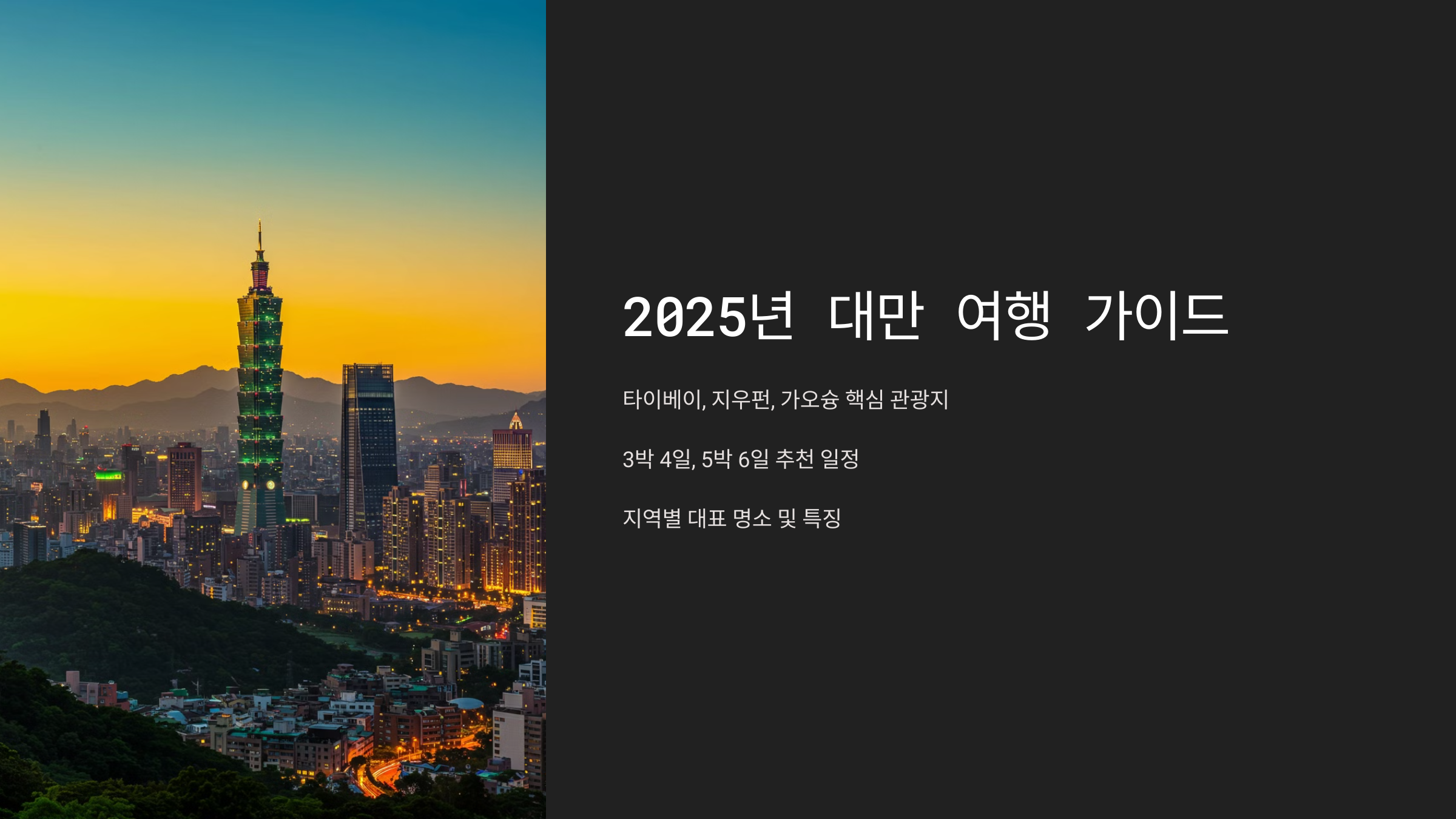 2025년 최신 여행 트렌드에 맞춰, 핵심 명소, 맛집, 교통, 쇼핑까지 모두 정리했어요! 지금부터 대만 여행을 200% 즐기는 방법을 알려드릴게요. 😊