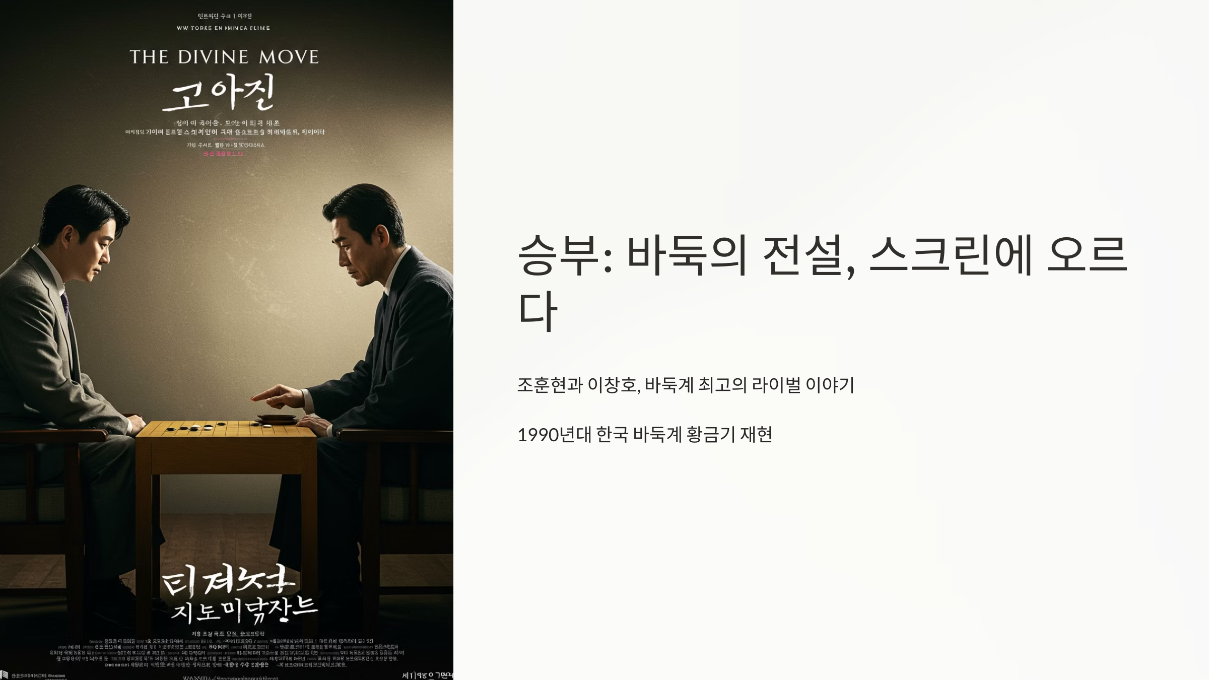 대한민국 바둑계를 대표하는 두 거장, 조훈현과 이창호의 치열한 사제 대결을 그린 이 영화는, 단순한 경기 그 이상의 감동을 전해줘요.
