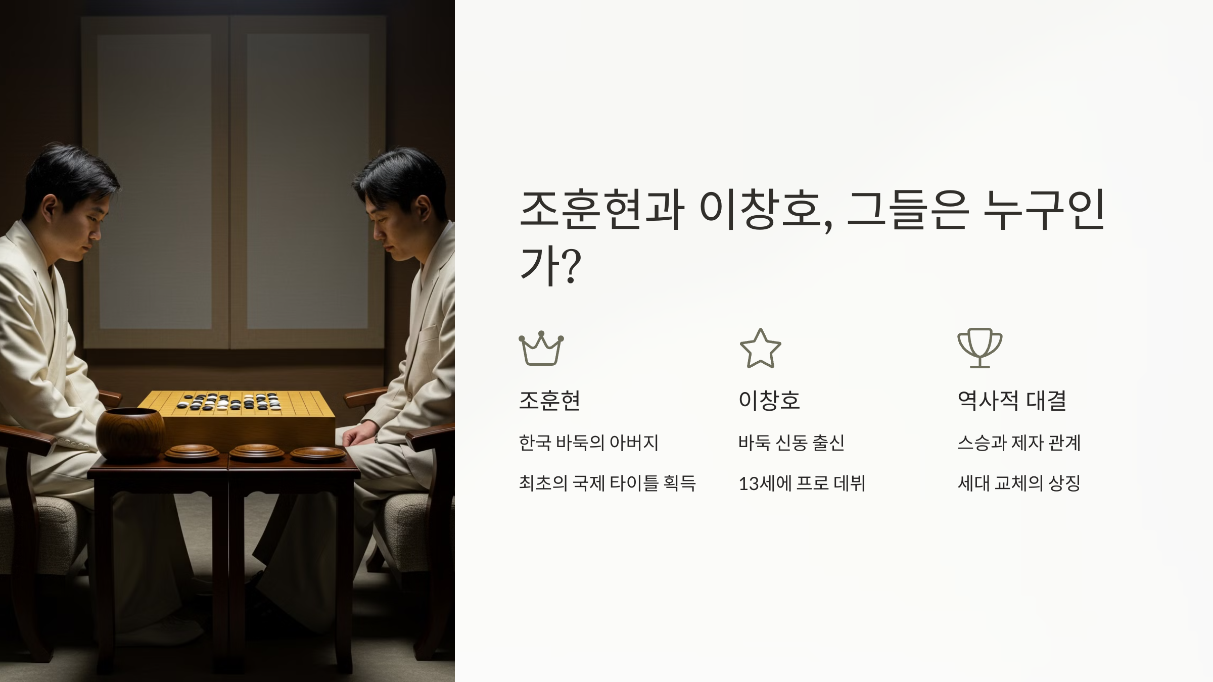 이제 다음은, 이 전설의 두 인물 조훈현과 이창호에 대해 더 자세히 알아볼게요.