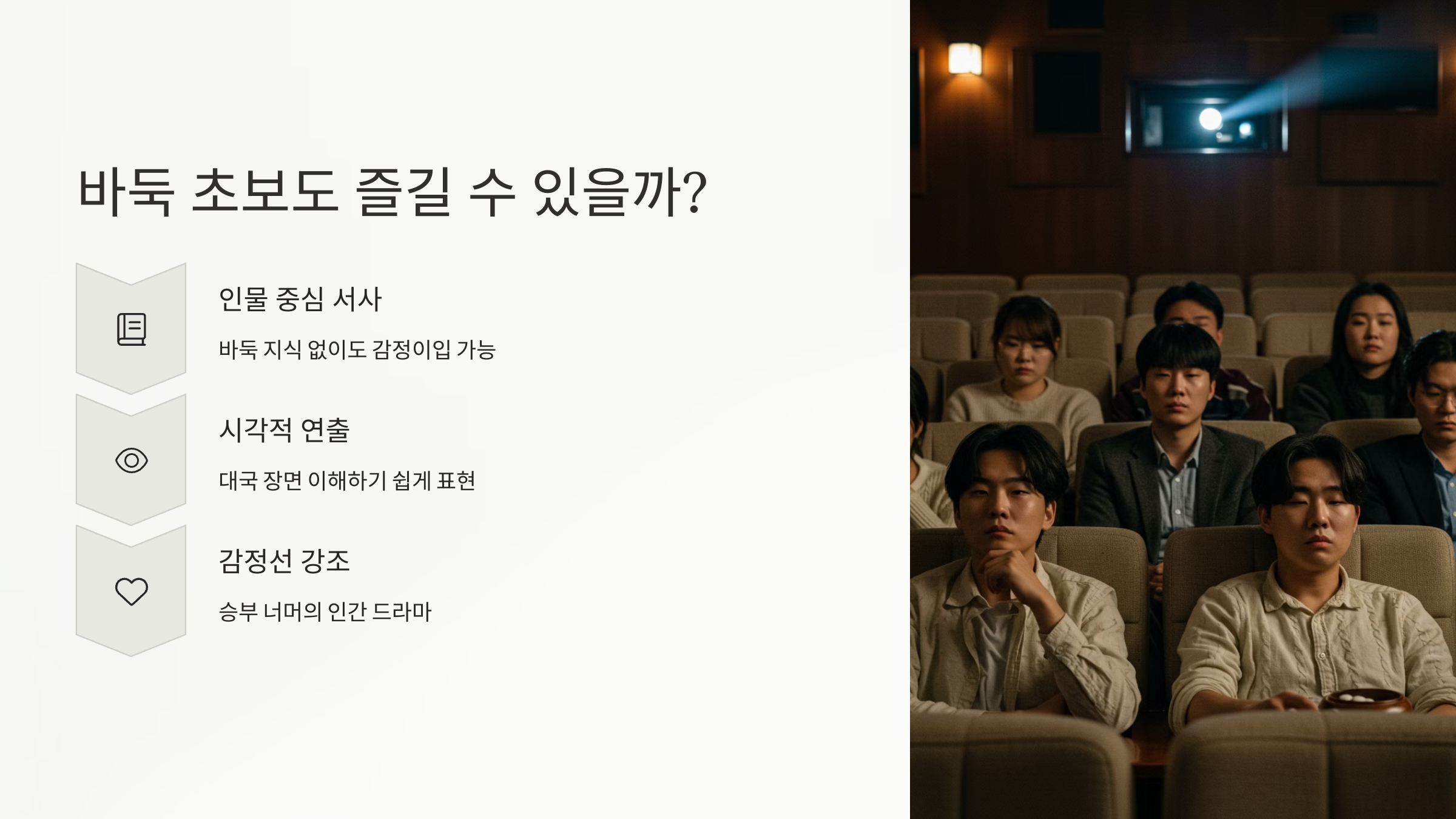 바둑을 스포츠 영화로 만들 수 있었던 가장 큰 이유는 사람의 심리예요. 눈빛, 망설임, 침묵 속에서도 모든 것이 이야기되죠.