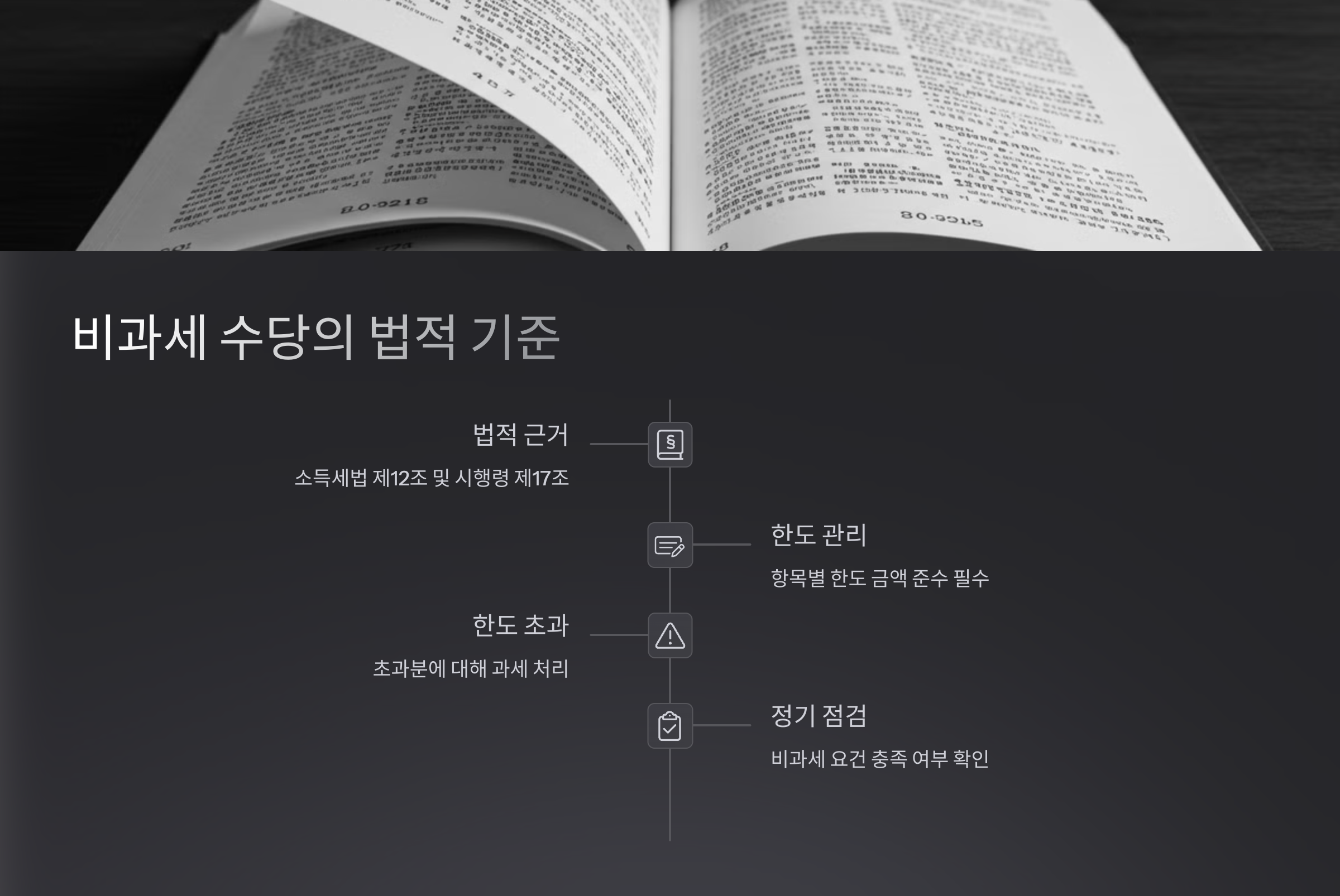 또한 회사는 비과세 수당을 지급한 경우, 급여명세서와 회계 장부에 해당 항목을 명확히 표시해야 하고, 실제 사용 내역이나 증빙자료를 보관해야 해요. 이를 근거로 세무조사 시 합법성을 입증할 수 있어요.