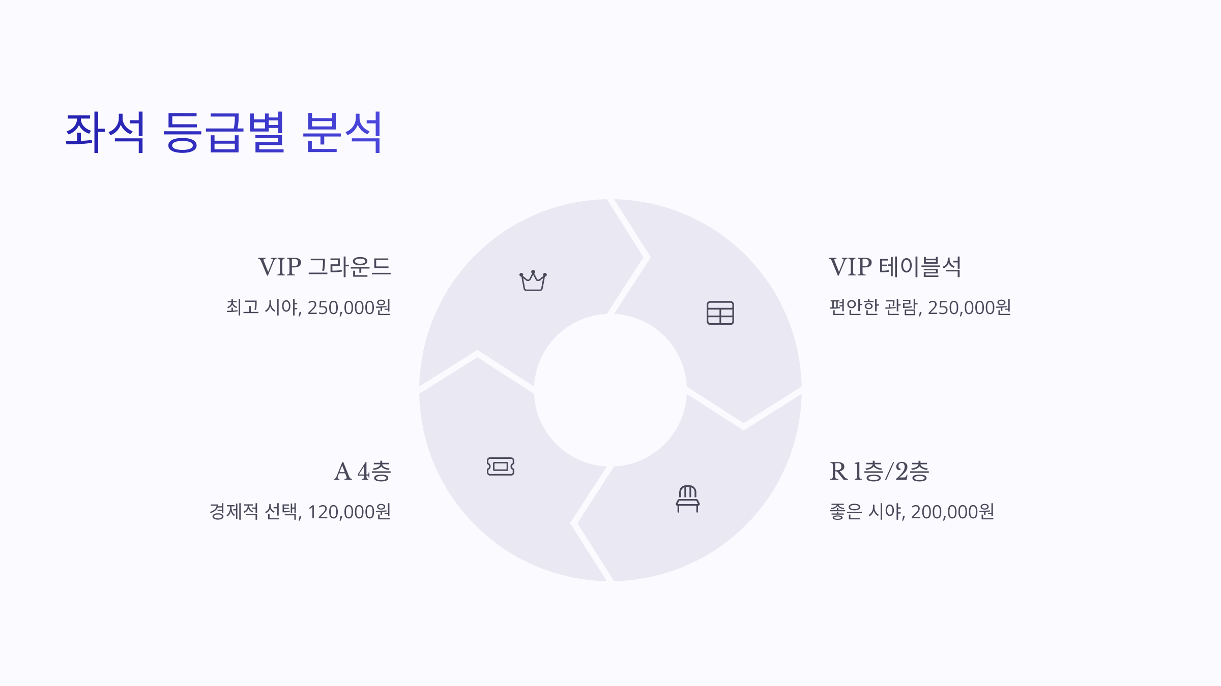 | 3층 지정석 | 거리 멀지만 가격 저렴 | 예산 중요시하는 관람객 |