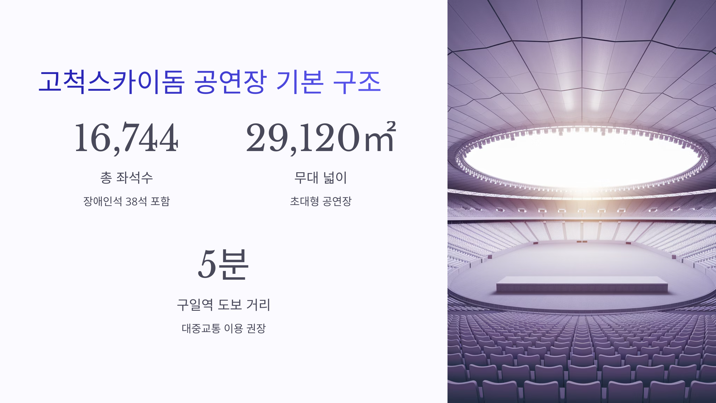 고척스카이돔은 원래 야구장으로 설계됐지만, 대형 콘서트나 e스포츠 대회 등 멀티 이벤트 공간으로도 잘 활용되고 있어요.