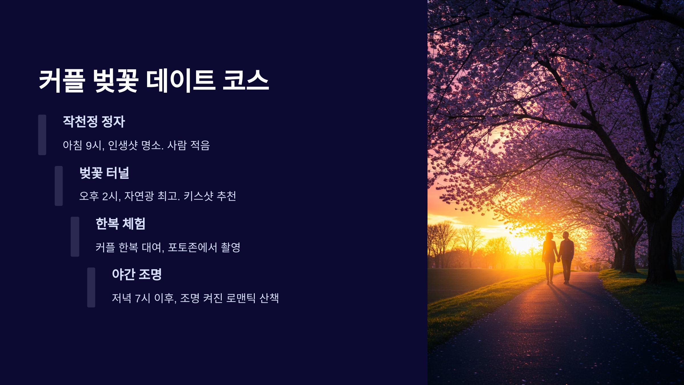 ✅ 데이트 팁: 벚꽃잎 날릴 땐 슬로우모션 영상 촬영도 추천! 살랑거리는 벚꽃 속 웃는 두 사람, 평생 추억이 될 수 있어요.