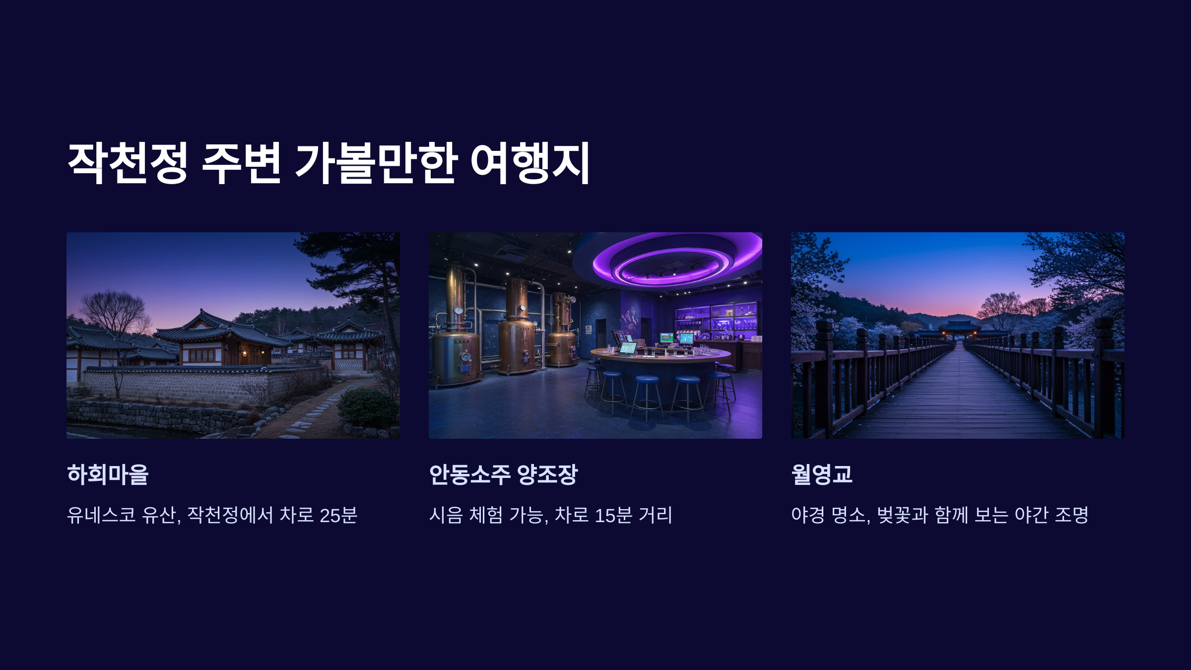 나의 느낌으로 말하자면, 이 세 곳만 돌아도 “오늘 진짜 잘 놀았다” 싶은 만족감이 확 와요. 작천정과 찰떡같이 어울리는 후속 코스들만 골랐어요!