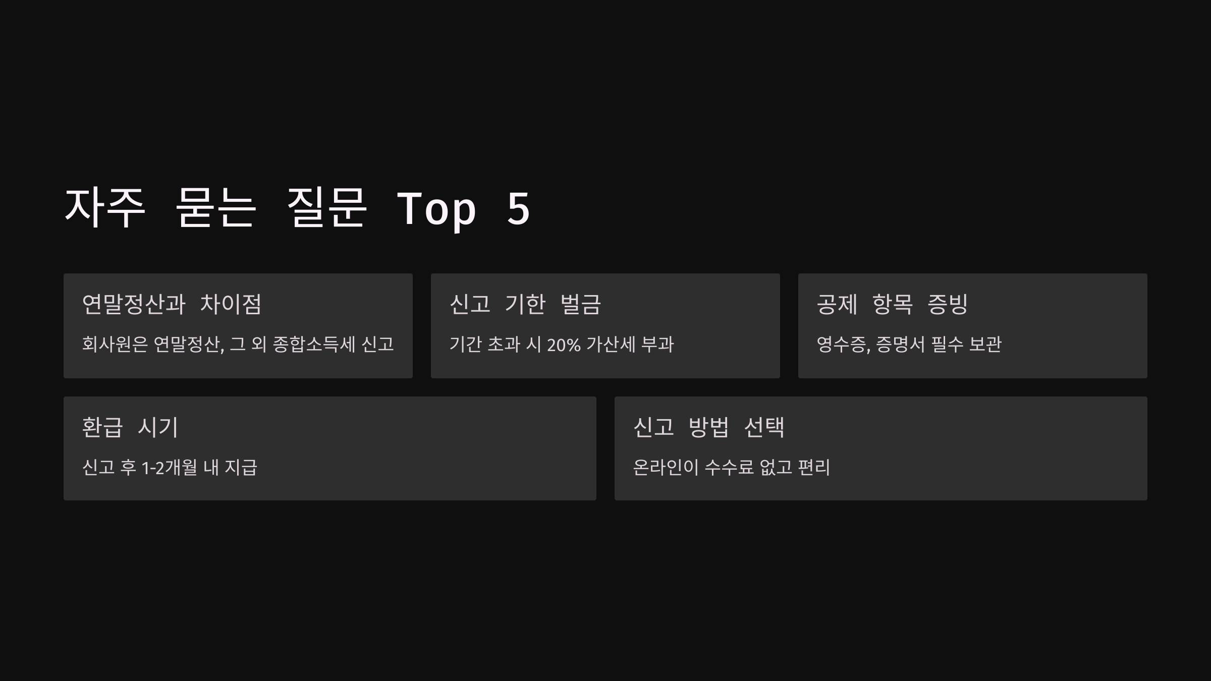 | 세액공제 활용 | 의료비, 교육비 공제 체크 | 세금 직접 절감 |