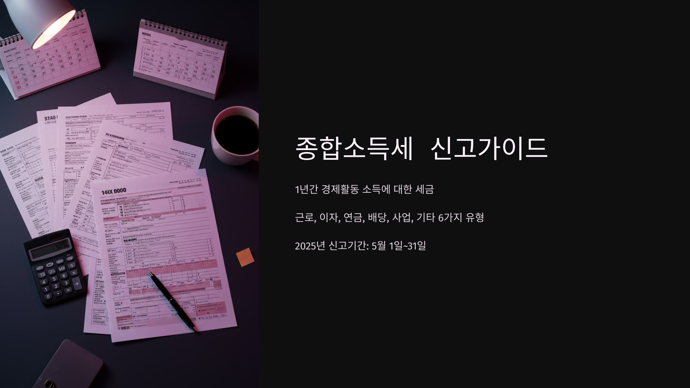 종합소득세는 개인이 1년 동안 벌어들인 소득을 한꺼번에 계산해 세금을 부과하는 제도예요.