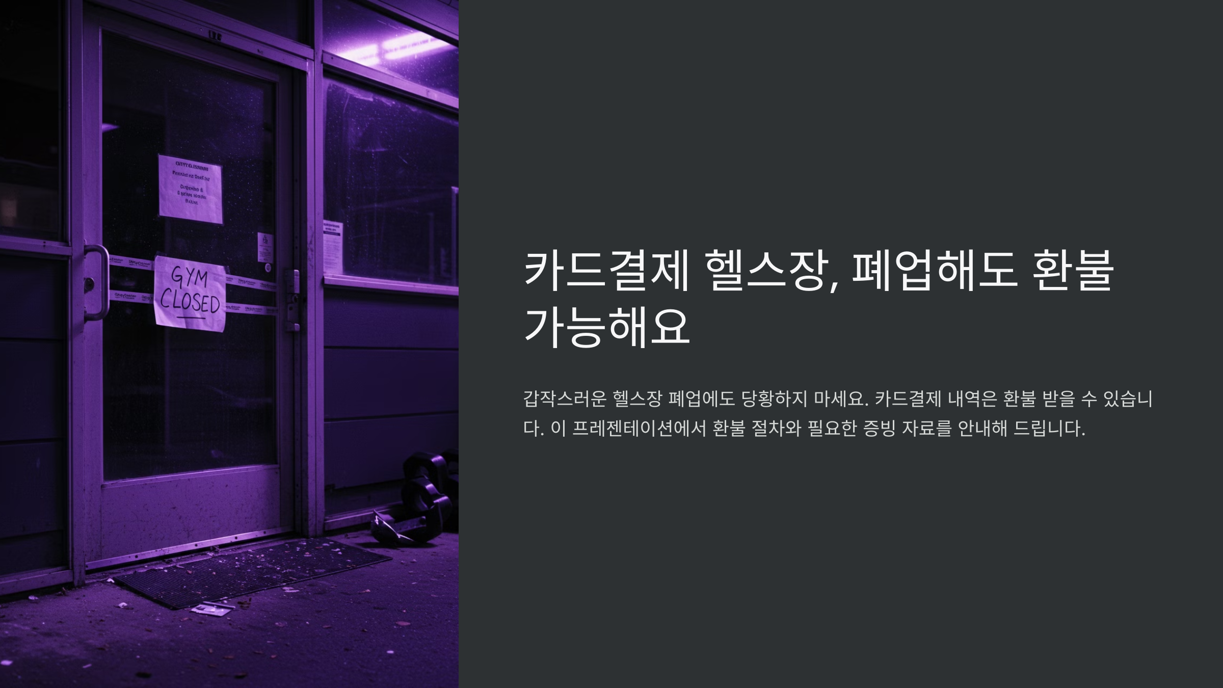 이번 콘텐츠에서는 폐업한 헬스장에 카드 결제한 경우, 환불받는 절차를 상세하게 알려드릴게요.