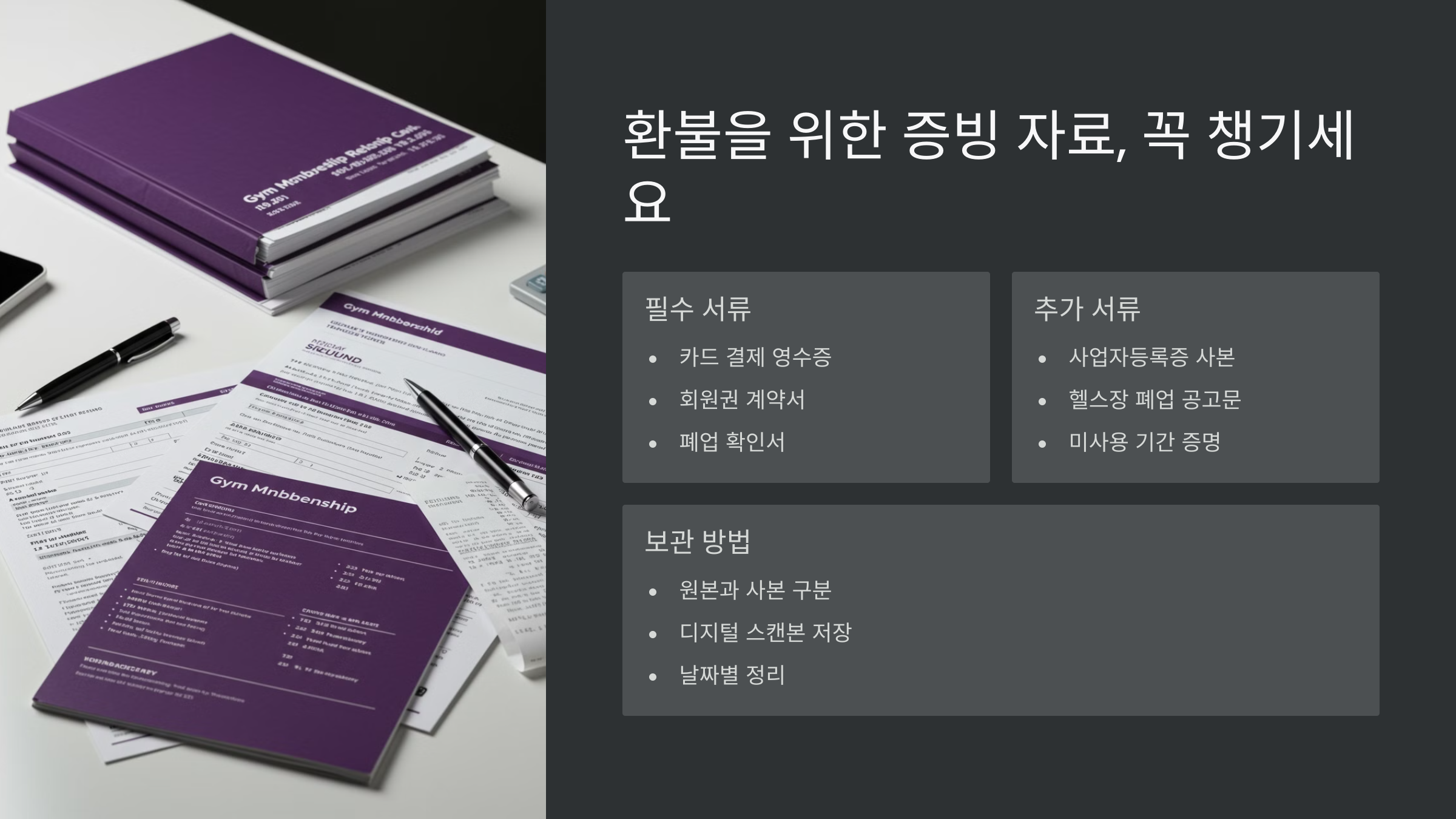 헬스장이 폐업했다는 말만으로는 부족하고, 문서나 사진, 문자기록처럼 '보이는 증거'가 있어야 처리 속도도 빨라진답니다.
