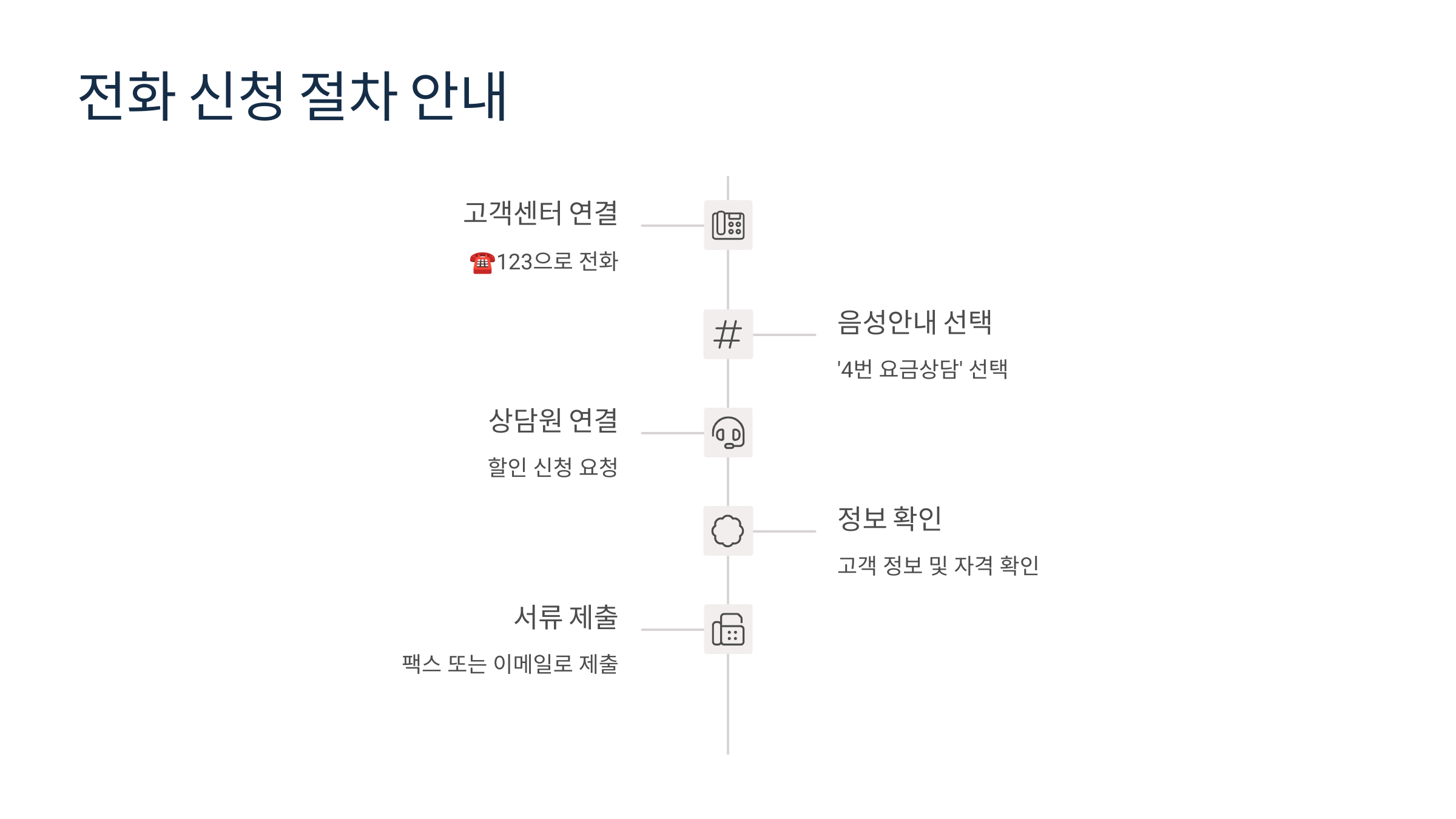 혹시 인터넷이 어려우시거나 직접 방문이 부담된다면? 걱정하지 마세요! 한국전력 고객센터(국번 없이 123)로 전화를 걸어도 감면 신청이 가능해요.