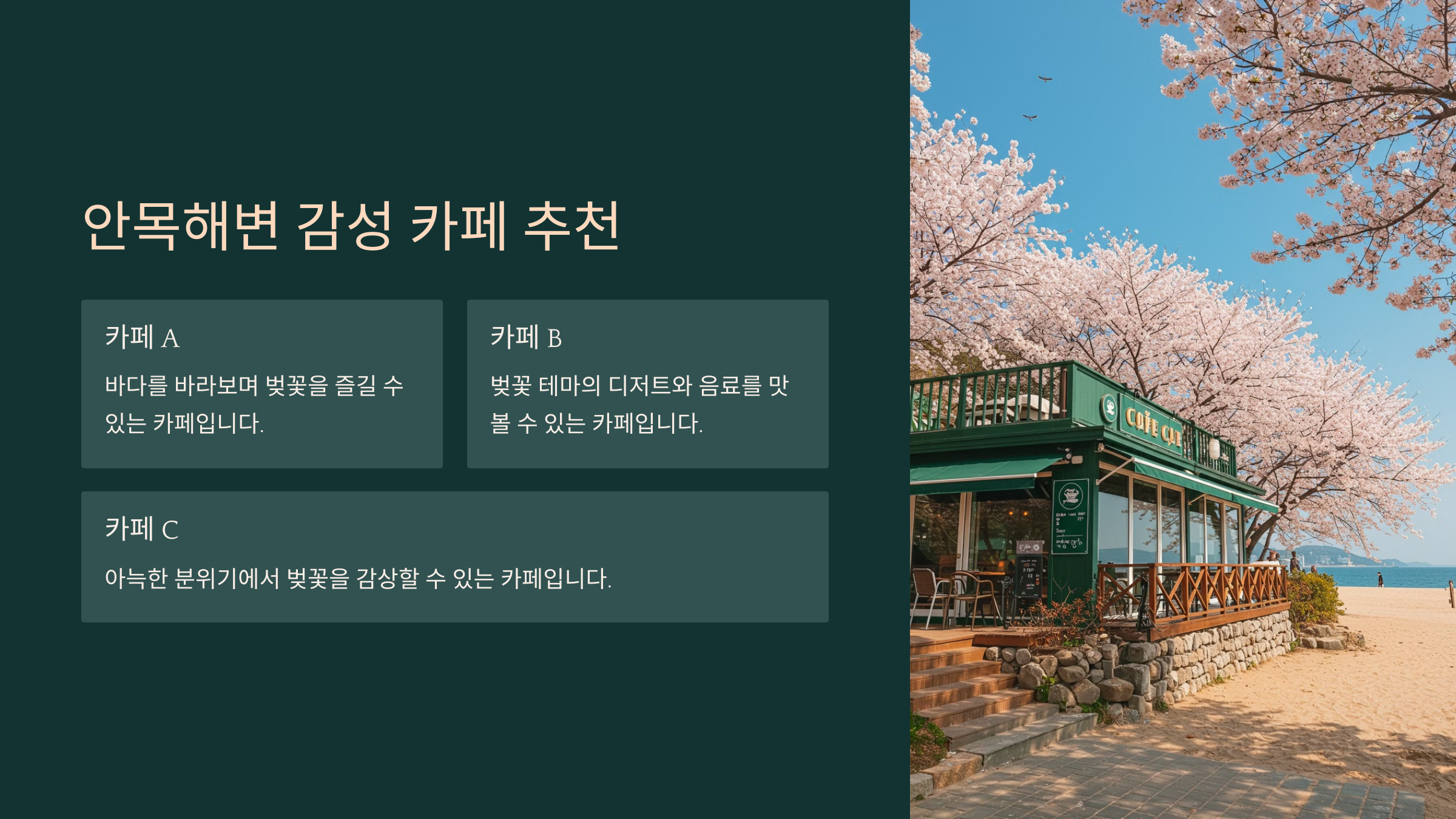 - 📸 루프탑 좌석이 있는 카페를 선택하면, 벚꽃과 바다를 한눈에 감상할 수 있어요.