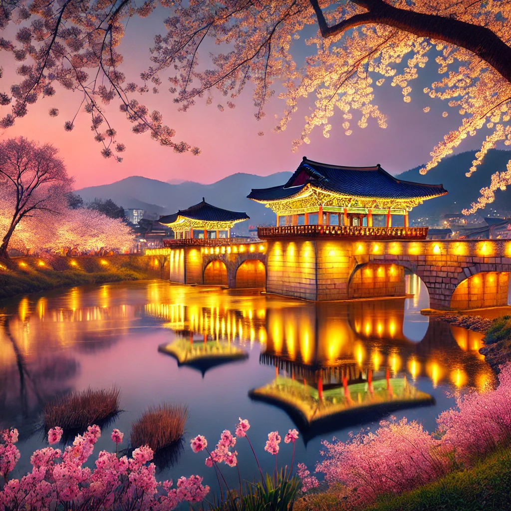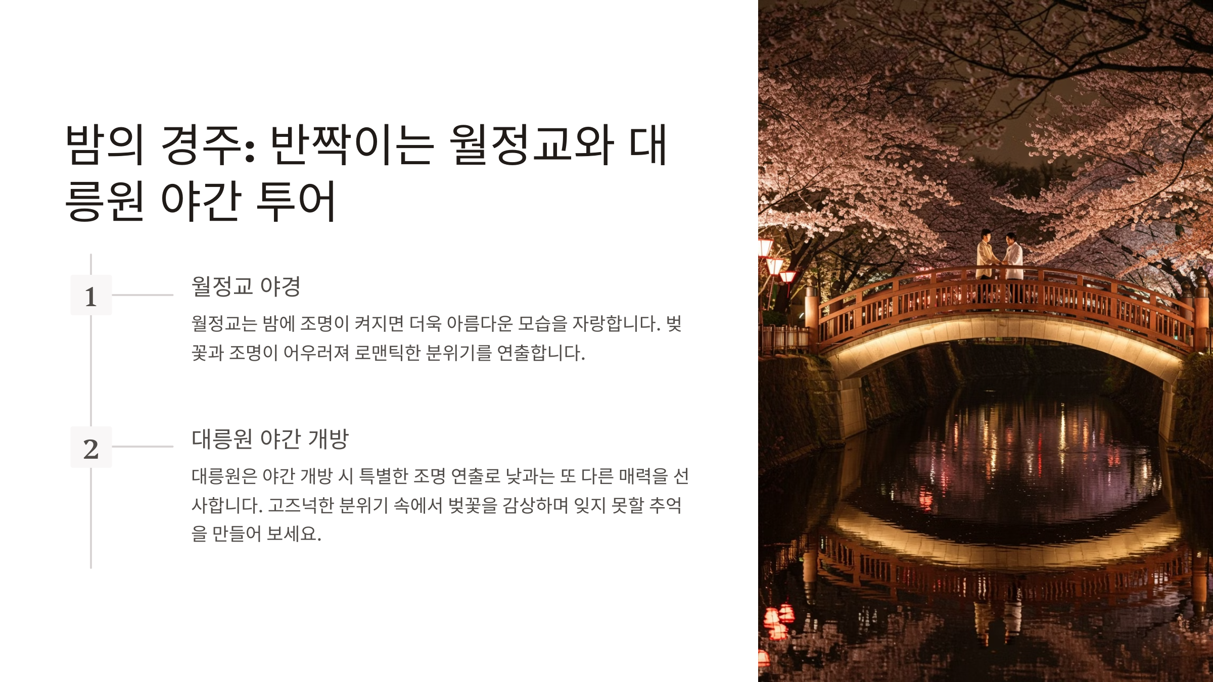 🌙 이제 벚꽃과 함께 경주의 로맨틱한 야경을 즐겨볼 차례예요! 반짝이는 조명 속에서 더욱 특별한 데이트를 원한다면? 다음 섹션에서 월정교 & 대릉원 야경 투어를 소개해 드릴게요! ✅