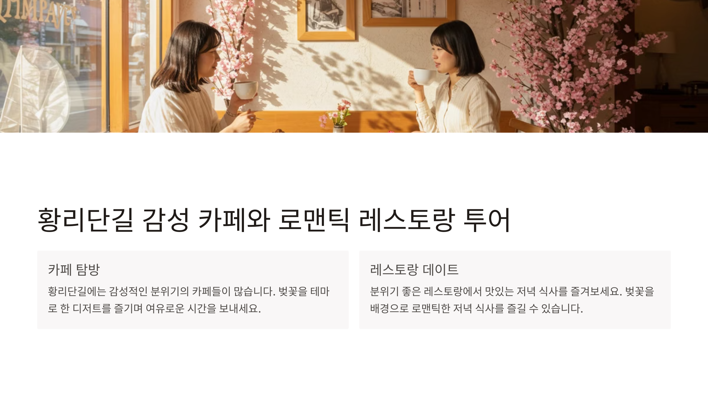 ☕ 경주 황리단길은 감성적인 카페와 분위기 좋은 레스토랑이 모여 있는 핫플이에요. 벚꽃을 구경한 후 한옥 감성이 가득한 카페에서 커피를 마시거나, 감성적인 레스토랑에서 여유로운 식사를 즐겨보세요. 💑