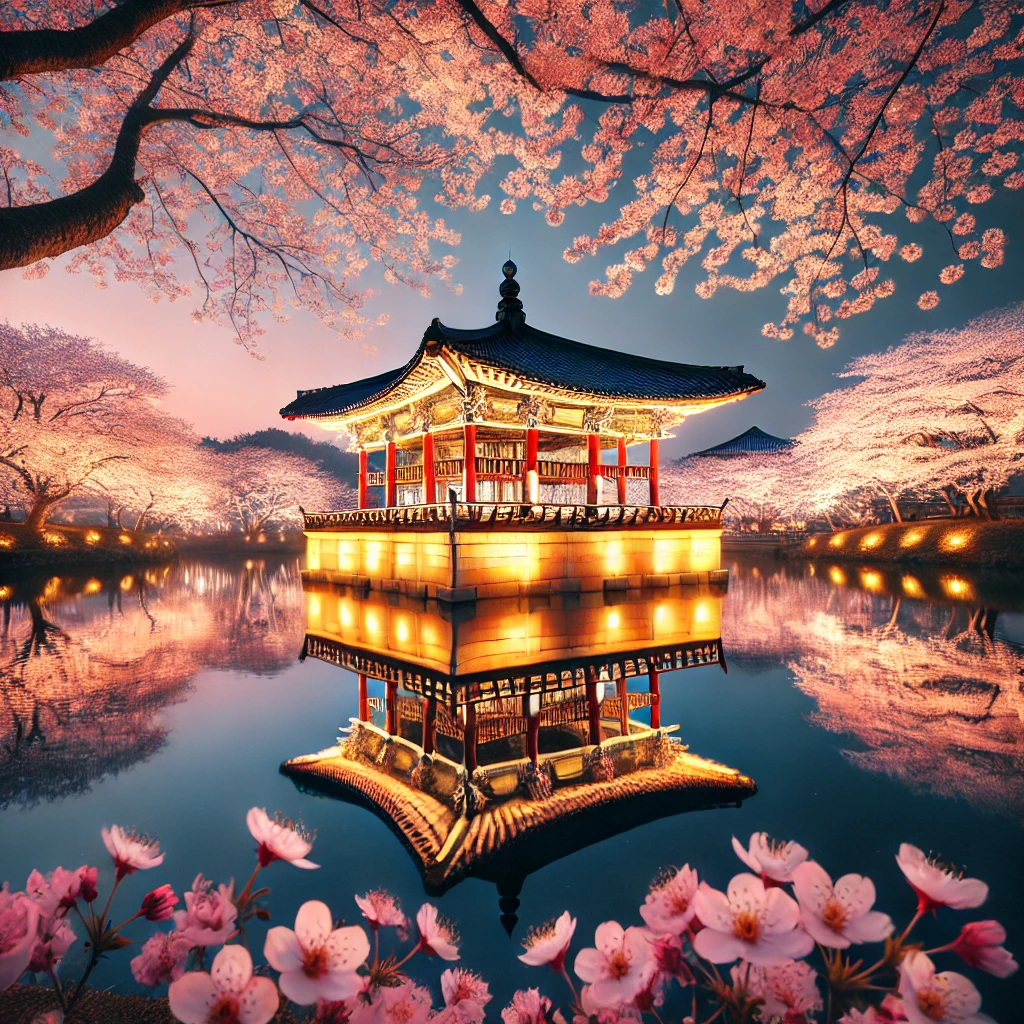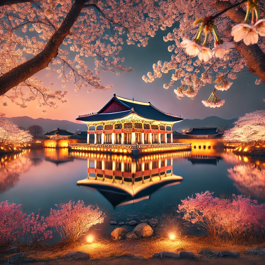 | 동궁과 월지 | 야경이 반영되는 아름다운 연못 | 연못에 비친 벚꽃과 조명 | 저녁 7~9시 (야경 타임) |
