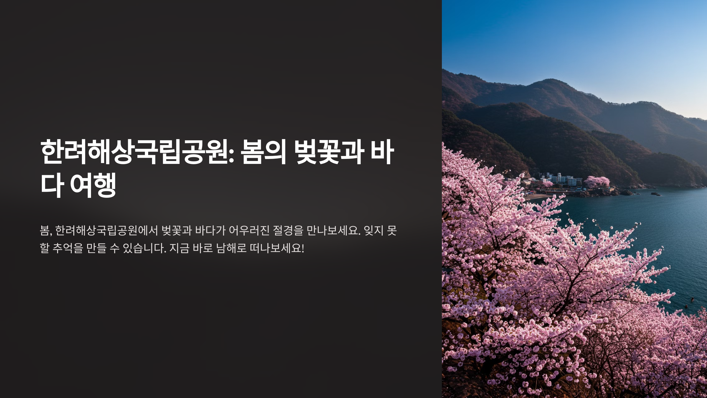 🌊 한려해상국립공원은 남해의 대표적인 자연 명소로, 벚꽃이 만개하면 푸른 바다와 분홍빛 벚꽃이 어우러지는 환상적인 풍경을 감상할 수 있어요. 🚢🌸
