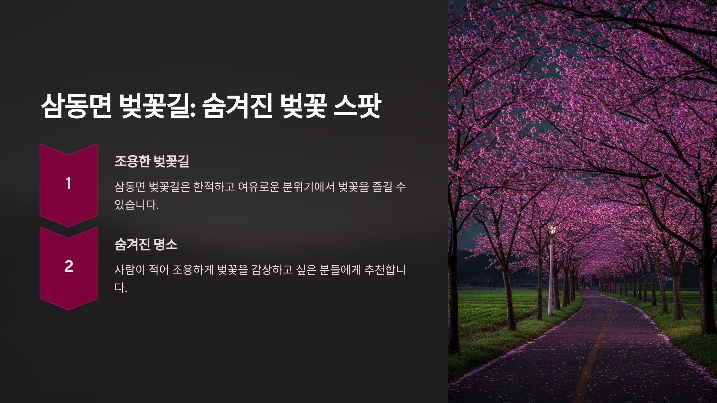 | 🌸 삼동면 벚꽃 드라이브 코스 | 길게 이어지는 벚꽃 터널 | 차량이 많지 않아 여유로운 드라이브 가능 | 오전 9~11시 |