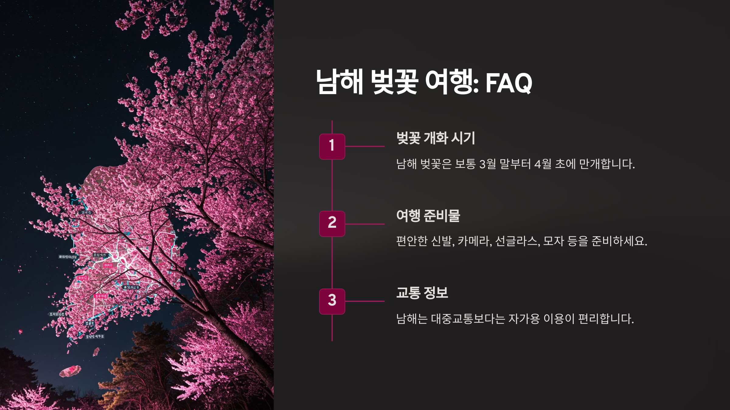 ❓ 남해 벚꽃+바다뷰 여행을 준비하면서 궁금한 점이 있다면? 마지막으로 자주 묻는 질문(FAQ)을 확인해 보세요! ✅