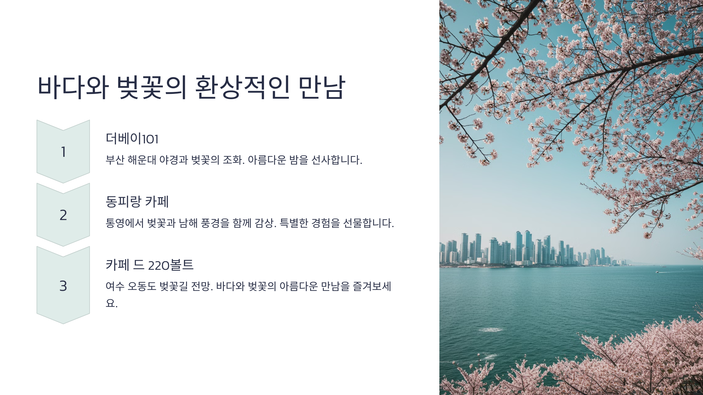 내가 생각했을 때, 오션뷰 카페는 로맨틱한 분위기를 극대화할 수 있는 최고의 장소예요! 벚꽃과 바다가 함께하는 특별한 순간을 꼭 경험해 보세요. 😊