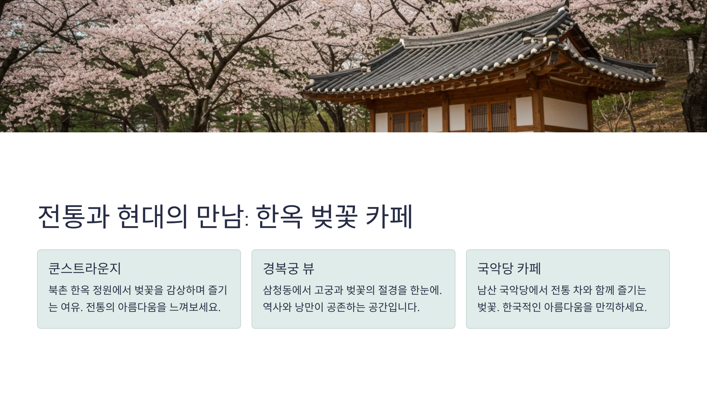 | 🍶 전통 한옥 카페 | 전주 한옥마을 | 전통 디저트와 벚꽃 뷰가 조화로운 공간 |