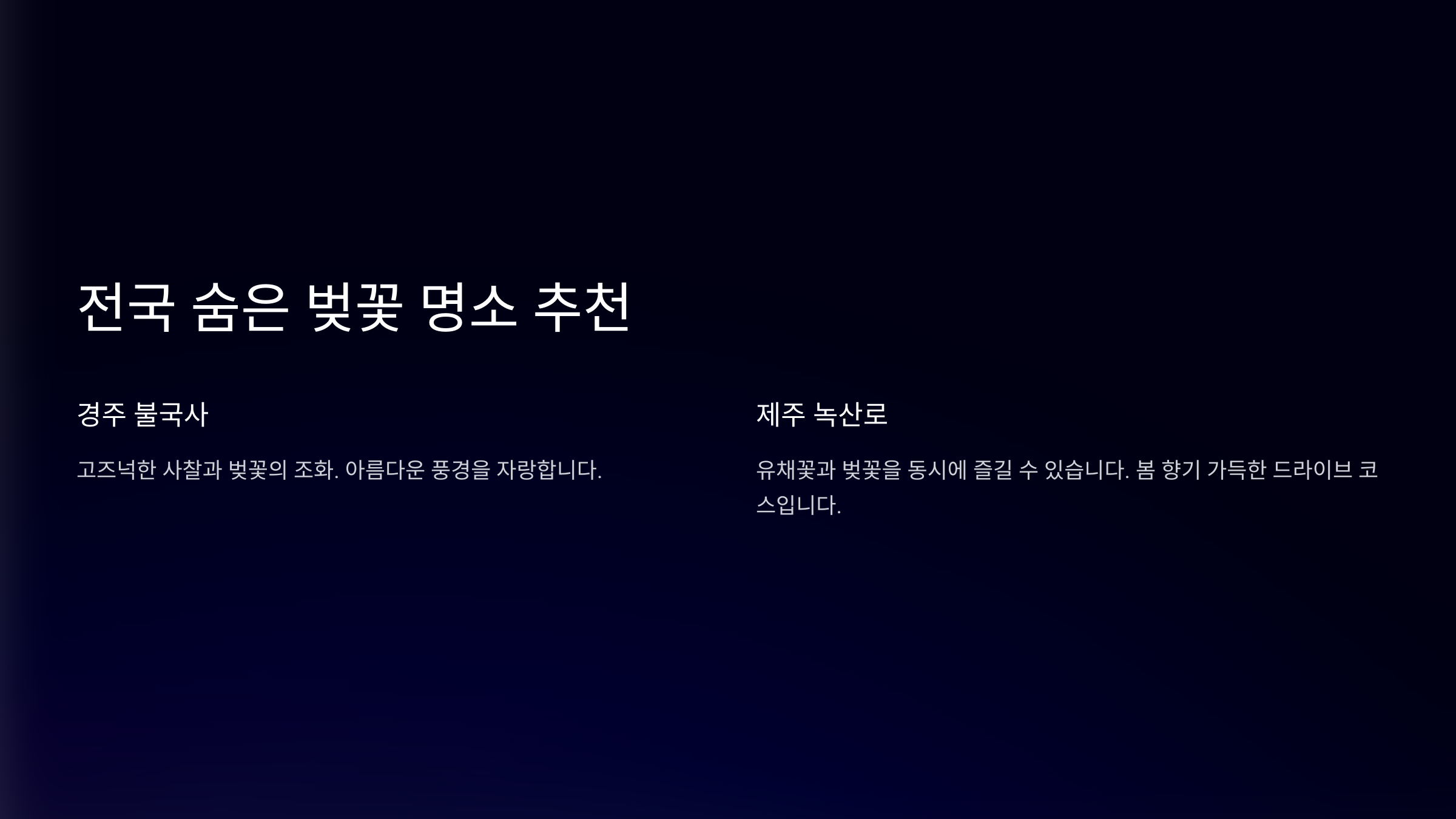 - 🎟️ 사전 예약: 벚꽃 시즌에는 숙소와 주차장이 혼잡하니 미리 예약하는 것이 좋아요.