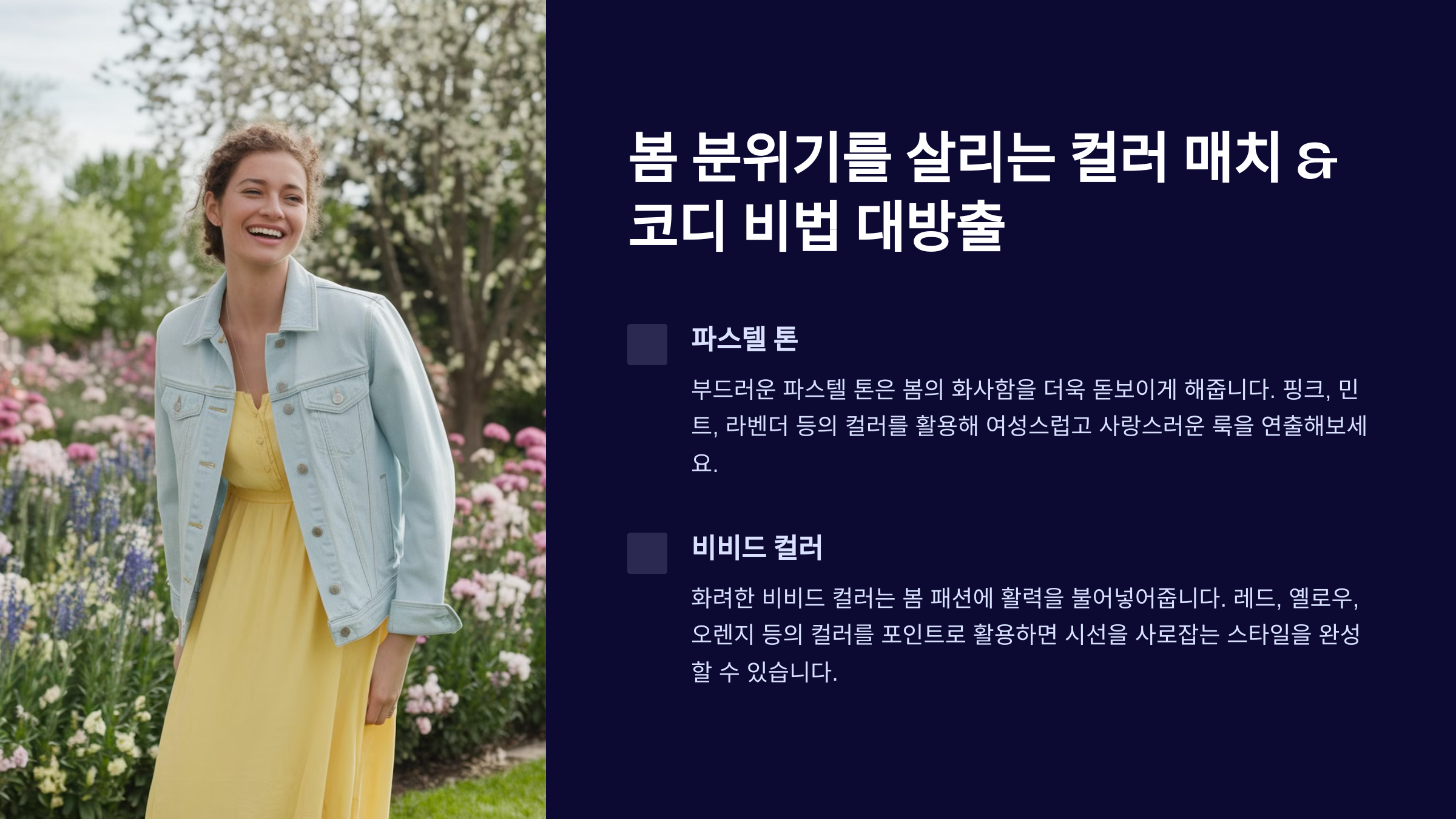 아우터를 정했다면, 이제 봄 분위기를 살리는 컬러 매치 팁을 살펴볼까요? 🎨