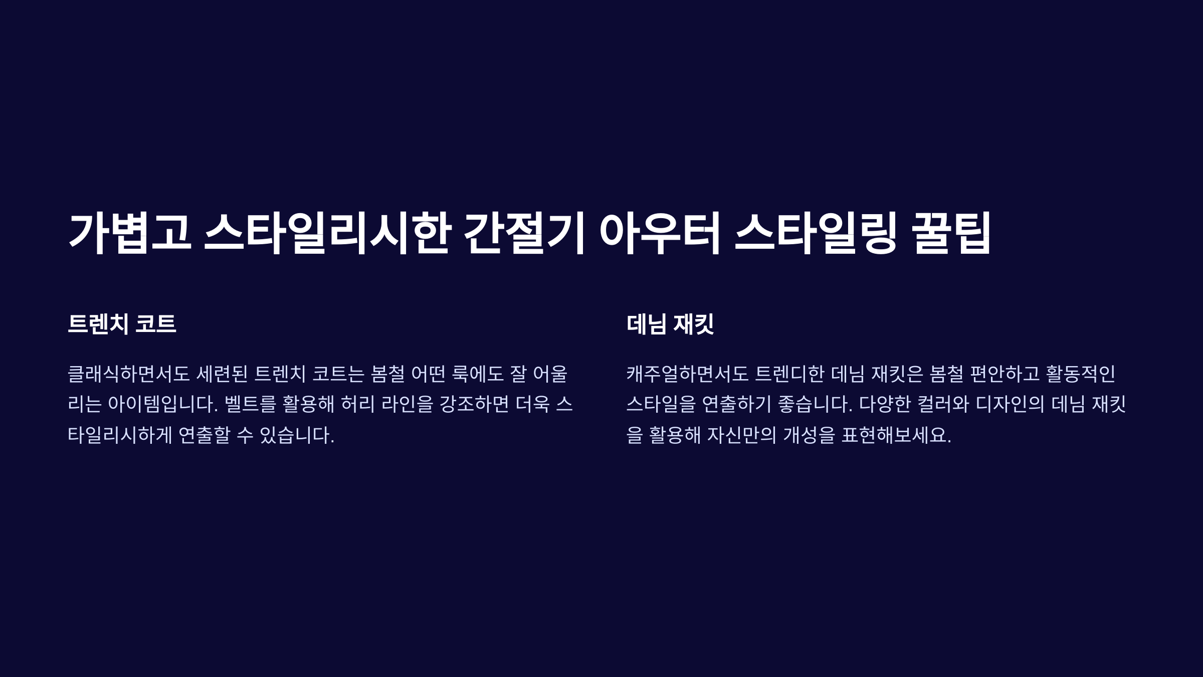 | 트렌치코트 | 봄 시즌 대표 아우터, 클래식한 디자인 | 슬랙스 + 로퍼와 매치 |