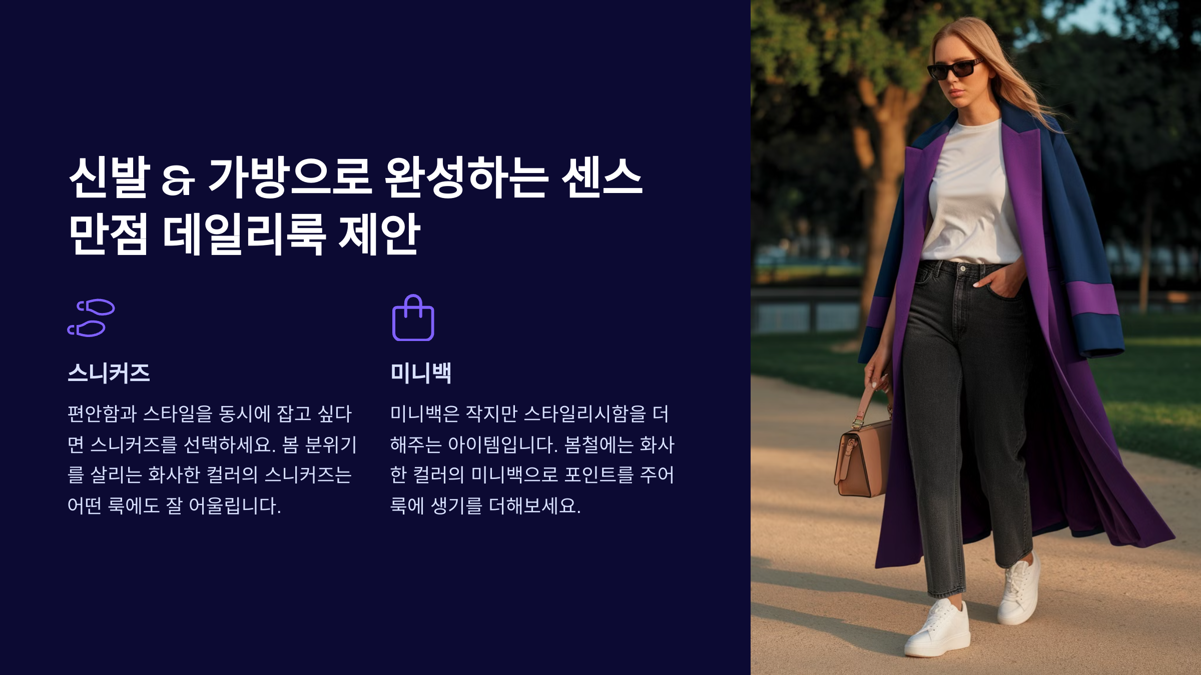신발과 가방은 코디의 완성이에요! 어떤 아이템을 선택하느냐에 따라 룩의 분위기가 완전히 달라질 수 있어요. 👠👜