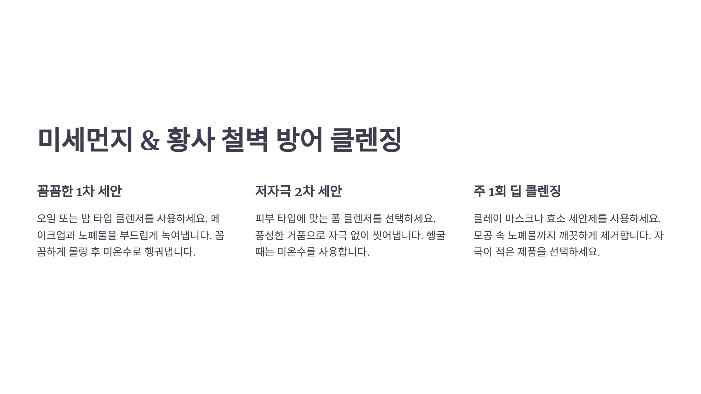 | 2️⃣ 2차 클렌징 | 미세먼지 세정 기능이 있는 약산성 폼클렌저 사용 | pH 5.5 약산성 폼클렌저 |