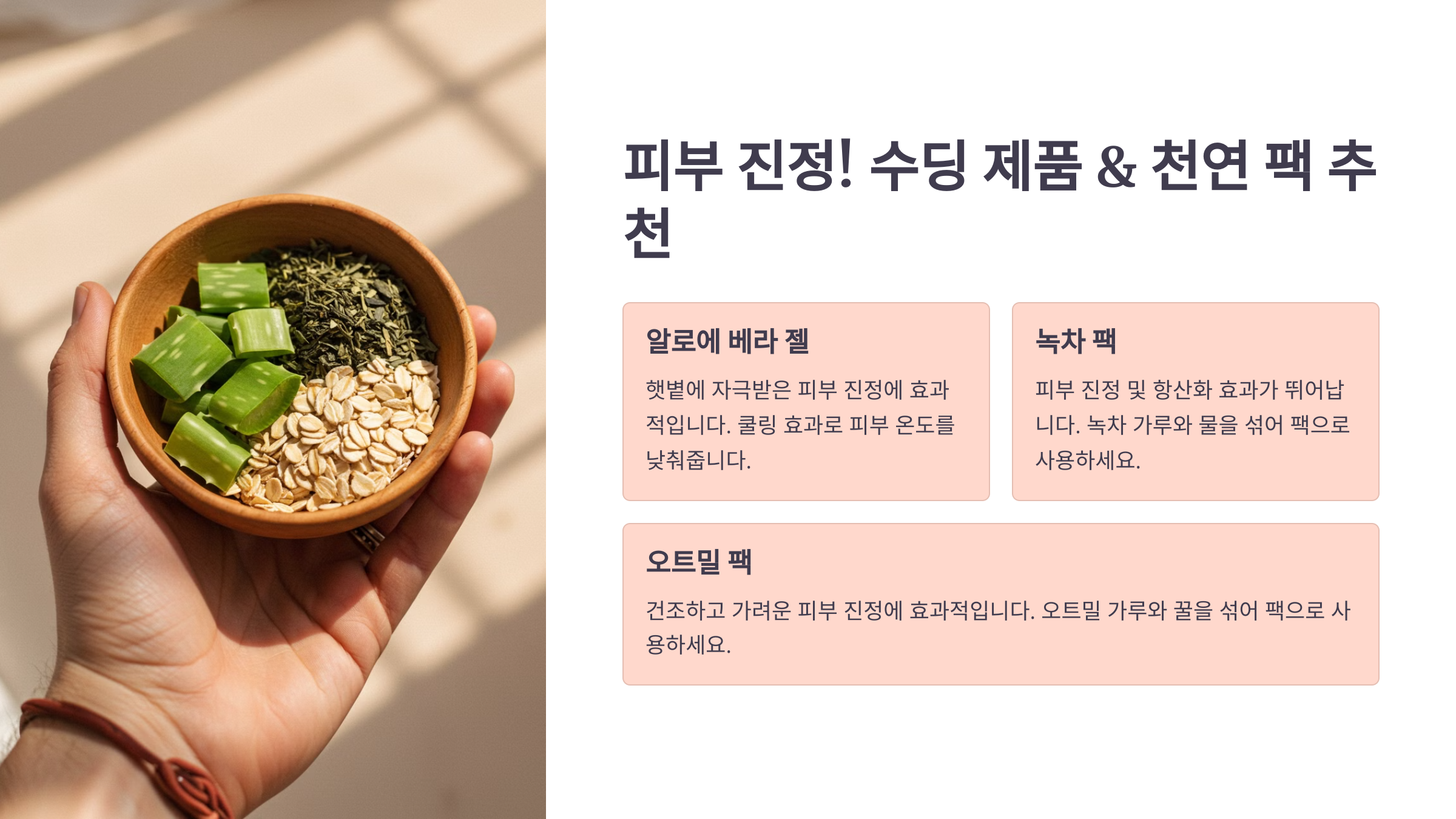 💡 아래에서 피부 진정에 좋은 수딩 제품 & 천연 팩 추천을 확인하고, 피부를 편안하게 가꿔보세요! ✅