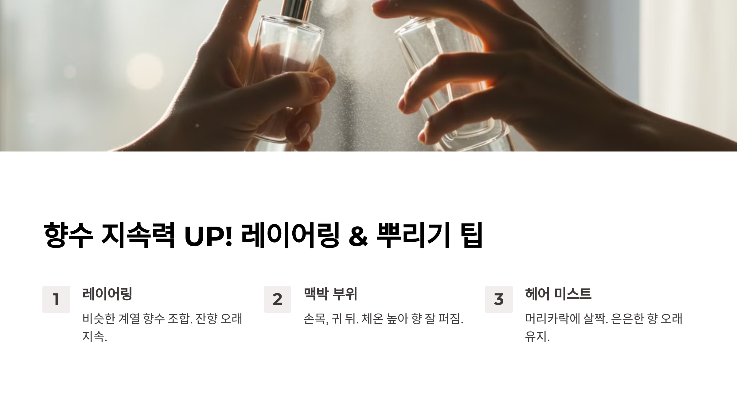 💨 "향을 오래 지속하는 방법은?" 다음 섹션에서 향수 레이어링 & 뿌리는 꿀팁을 확인해 보세요! ✅