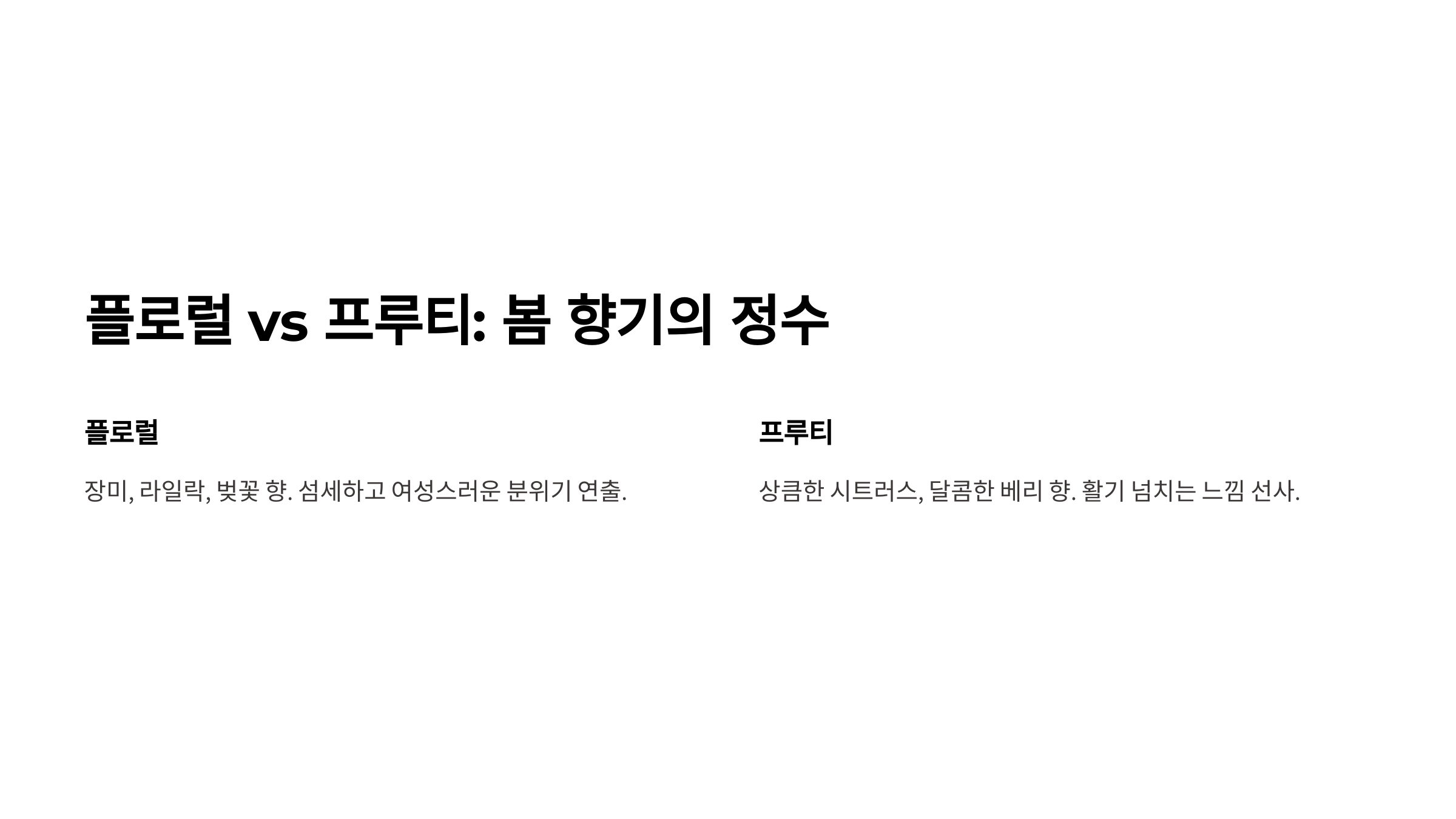 🌹 "플로럴 vs 프루티, 내 취향은?" 다음 섹션에서 봄에 어울리는 대표 향 계열을 확인해 보세요! ✅