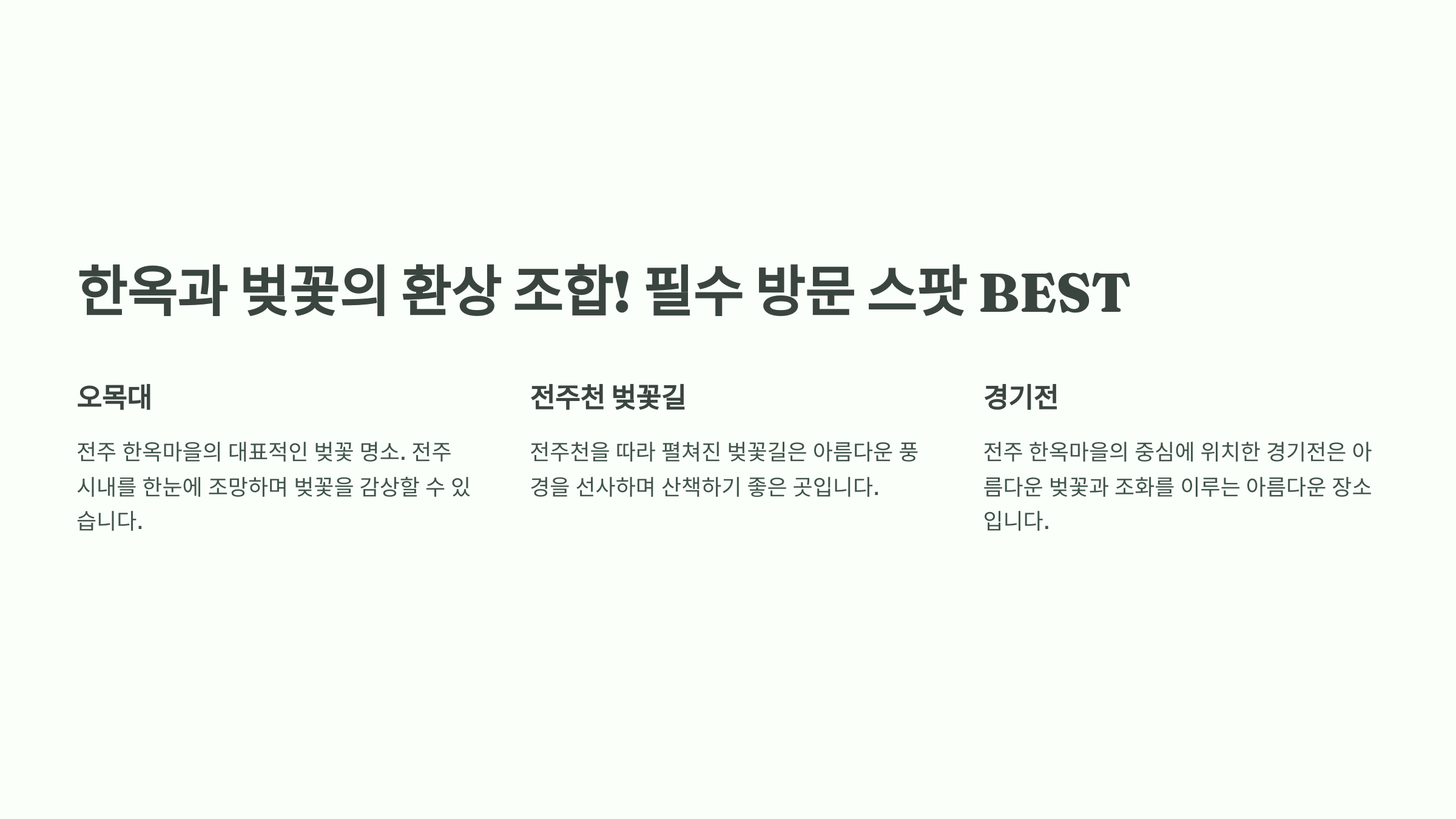 | 오목대 | 전주 한옥마을이 한눈에 내려다보이는 뷰 | 오전 9시 이전 (한적할 때) | 한옥 지붕과 벚꽃을 함께 담기 |
