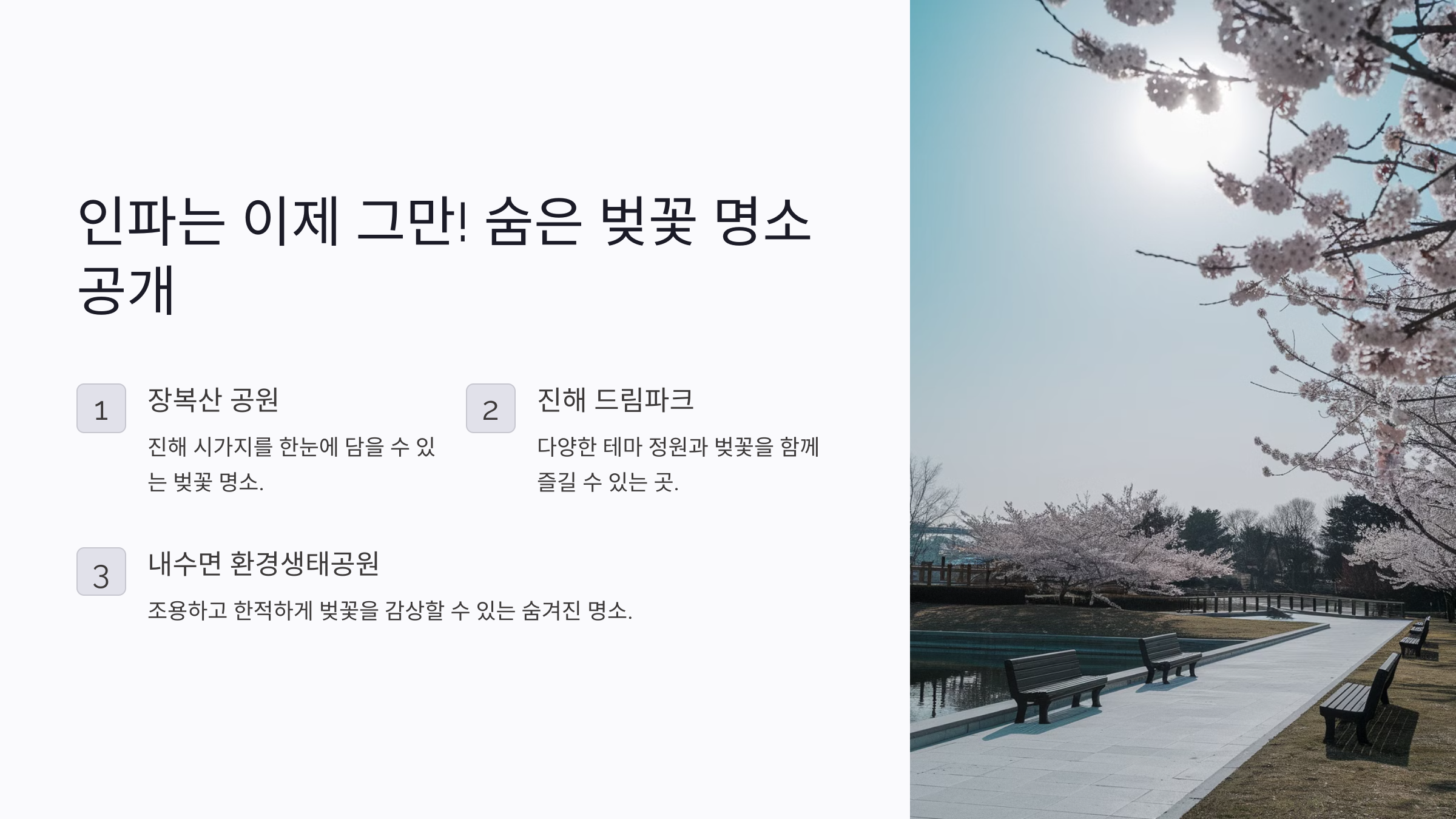 📢 이제 인파를 피해 한적하게 벚꽃을 즐길 수 있는 숨은 명소를 소개할게요!