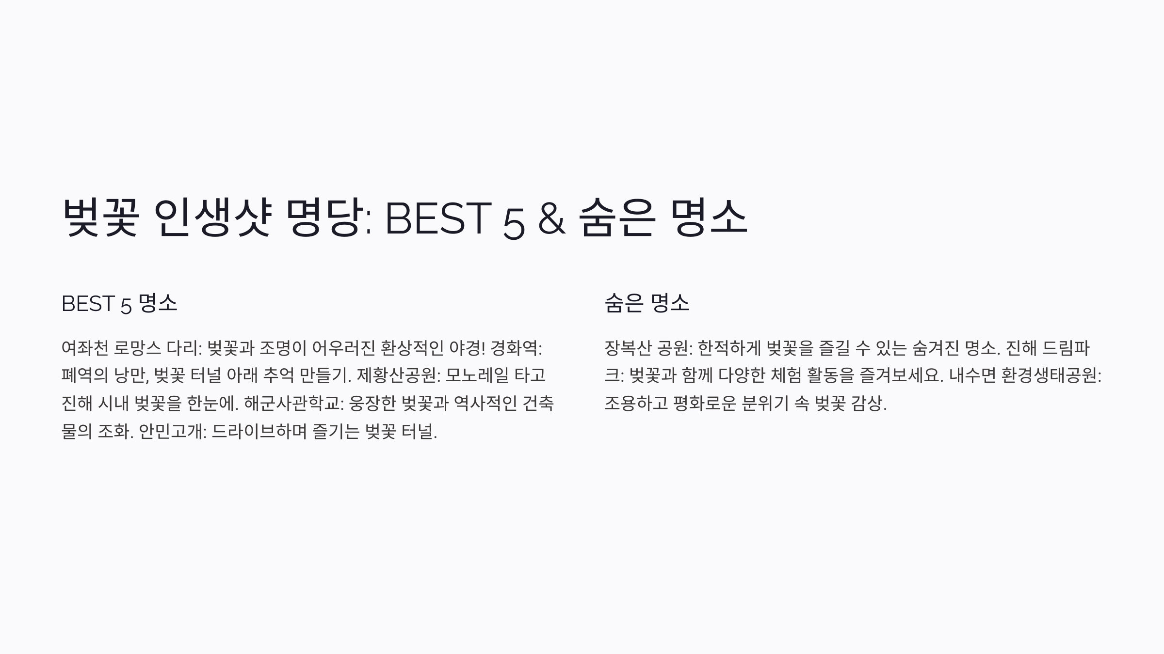 📢 다음으로, 벚꽃 명소 BEST 5와 인생샷 스팟을 공개할게요!