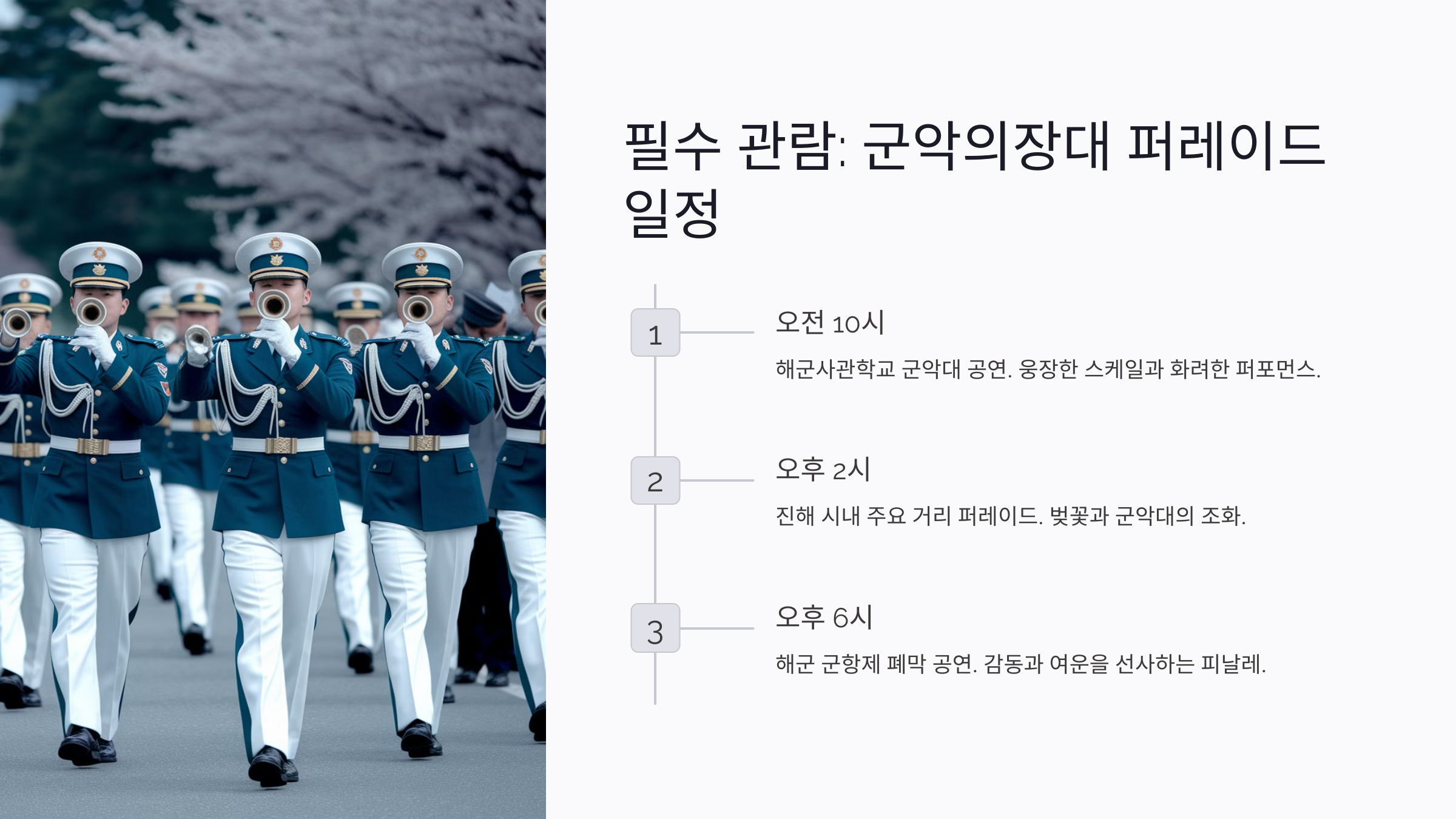 📢 이제 군항제의 하이라이트! 군악의장대 퍼레이드와 공연 일정을 알아볼까요?