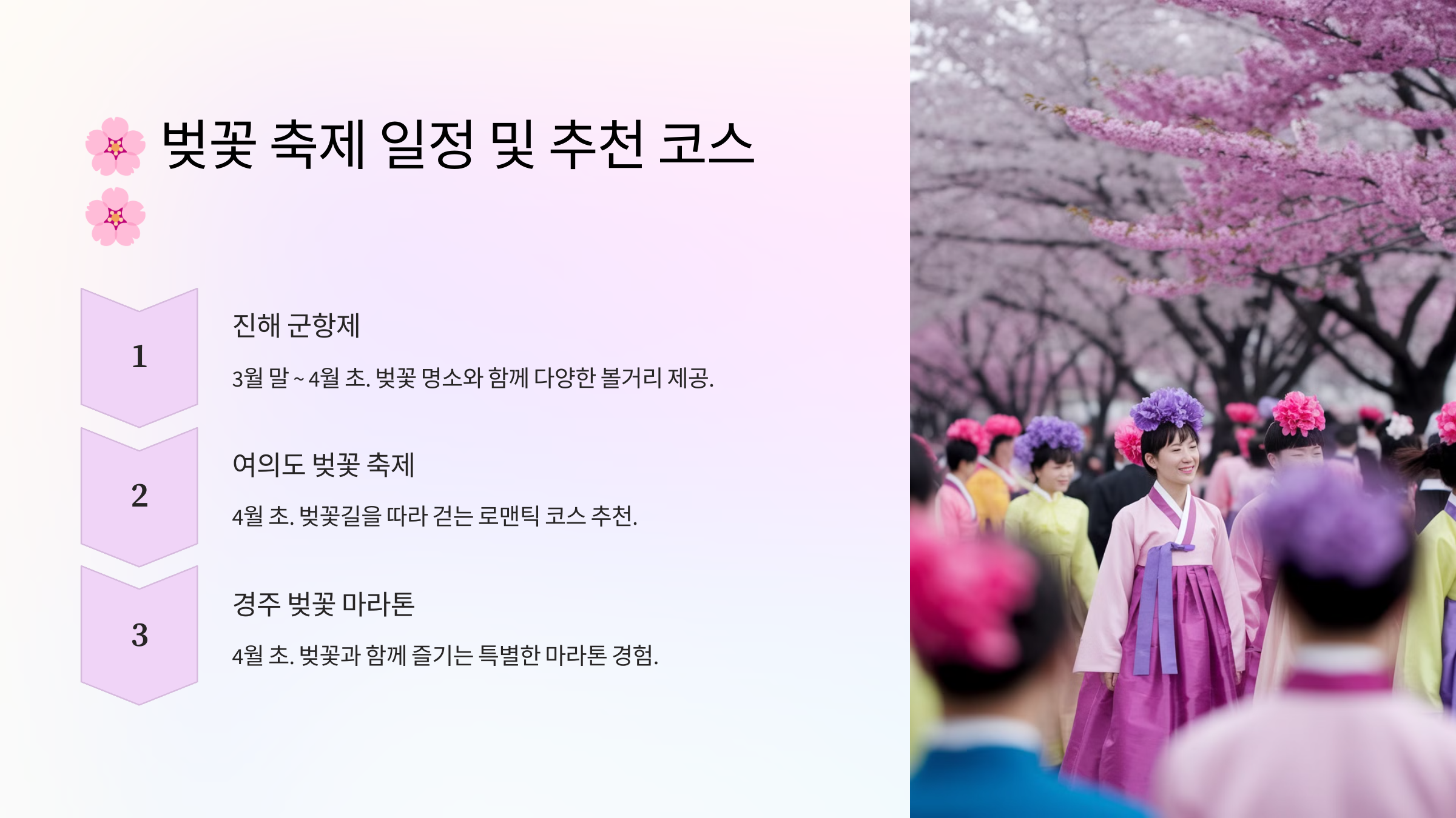 벚꽃 시즌에는 전국 각지에서 다양한 벚꽃 축제가 열려요. 축제 기간에는 야경 조명, 푸드트럭, 문화 공연 등 다채로운 볼거리가 마련돼요! 🎶