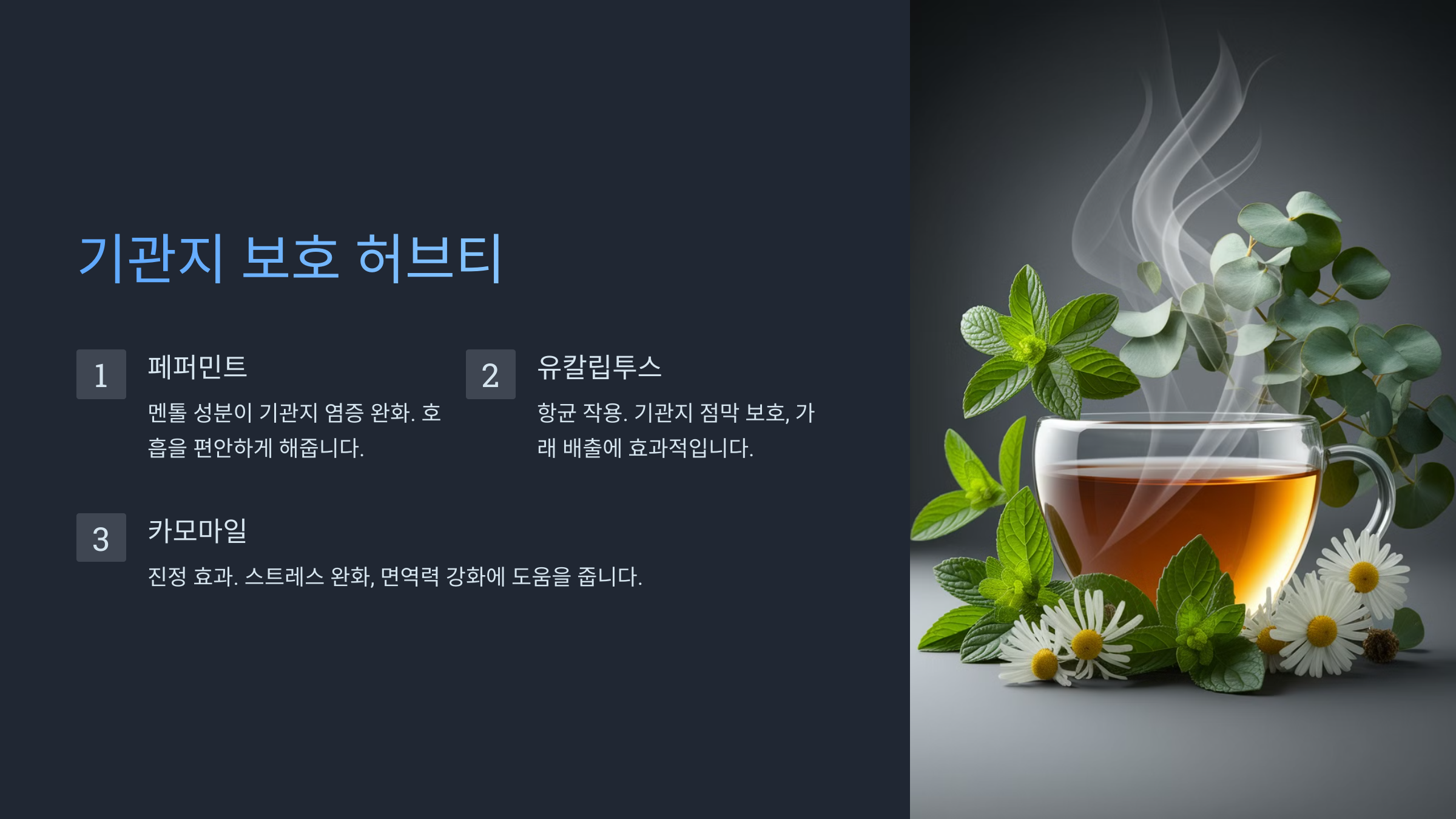 🌱 기관지 건강이 걱정된다면, 하루 한 잔의 허브티를 마시는 습관을 길러보세요! 따뜻한 차 한 잔이 기관지를 보호하는 데 큰 도움이 된답니다. 😊
