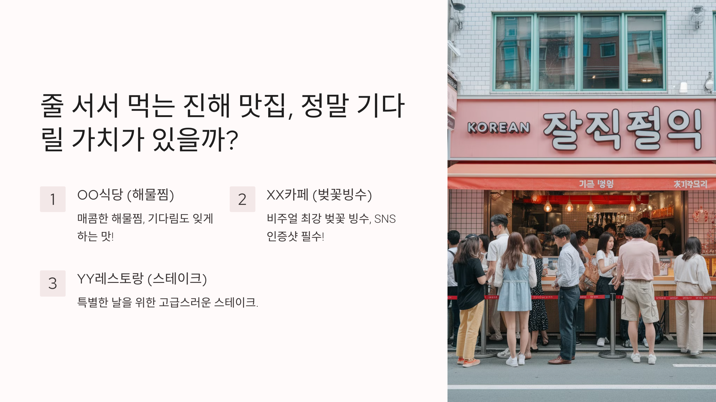 진해에는 오랜 시간 기다려야 겨우 맛볼 수 있는 인기 맛집들이 있어요. 하지만 긴 웨이팅이 아깝지 않을 만큼 맛있는 곳이라면 한 번쯤 도전해 볼 만하죠! 과연 기다릴 가치가 있는지 살펴볼게요. ⏳🍽️